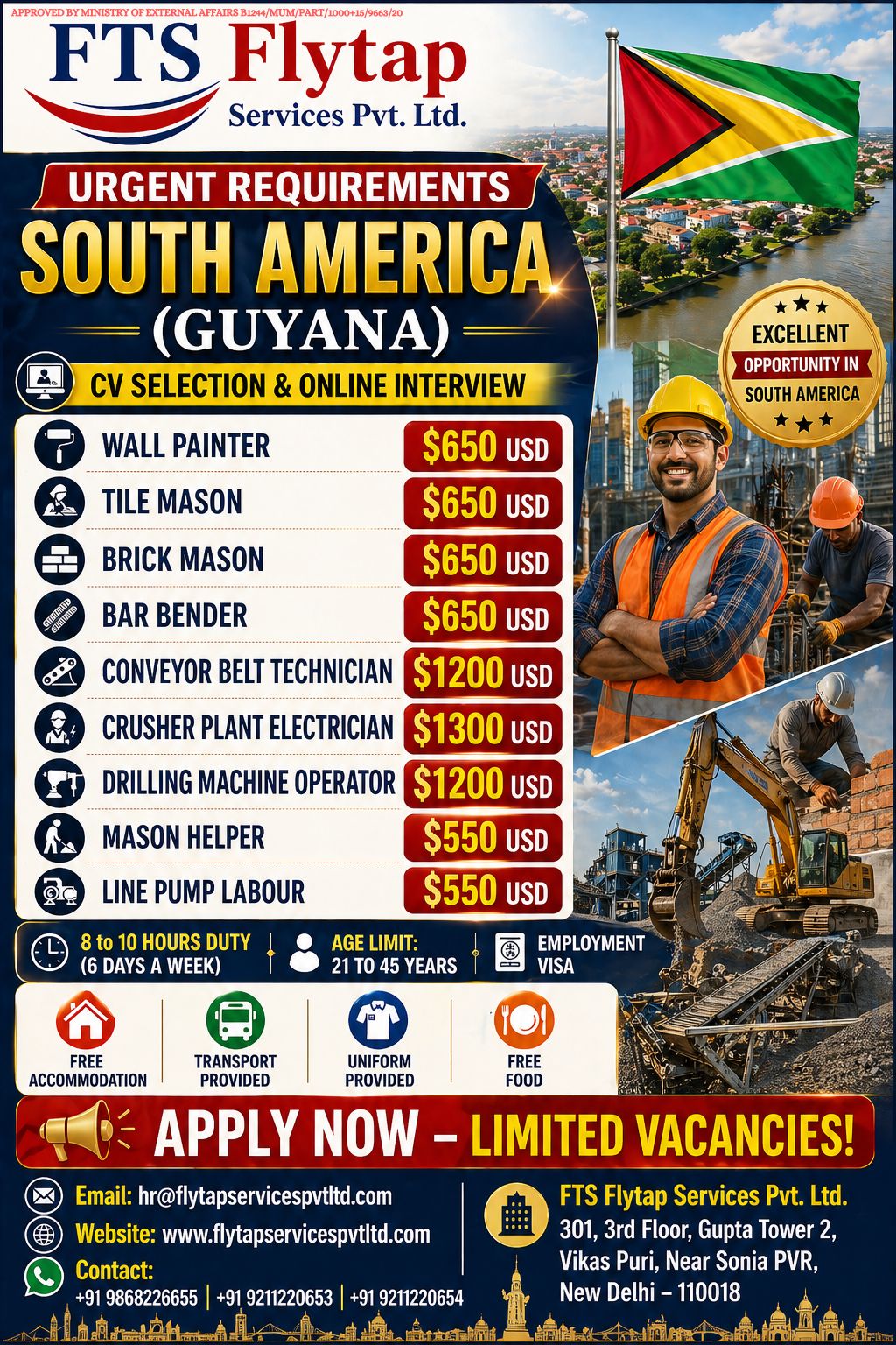πŸ“„ Job Description: FTS Flytap Services Pvt. Ltd. is hiring candidates for multiple construction and technical positions in Guyana, South America. Available roles include Wall Painter, Tile Mason, Brick Mason, Bar Bender, Conveyor Belt Technician, Crusher Plant Electrician, Drilling Machine Operator, Mason Helper, and Line Pump Labour. Salaries range from $550 to $1300 USD depending on the position. Candidates must be aged between 21 to 45 years and should be physically fit and hardworking. Skilled and semi-skilled applicants can apply, with experience preferred for higher roles. The company provides free accommodation, transportation, uniform, and food along with an employment visa. Duty hours are 8 to 10 hours per day, 6 days a week. Selection process includes CV shortlisting and online interview. This is a strong opportunity for candidates looking to work abroad, earn in USD, and gain international experience in construction and technical fields.