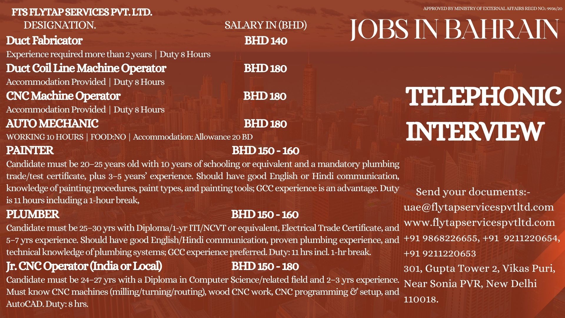 📢 Hiring for Bahrain 🇧🇭 | Urgent International Recruitment FTS Flytap Services Pvt. Ltd. is urgently hiring skilled & experienced candidates for Bahrain with attractive salary packages and stable long-term…