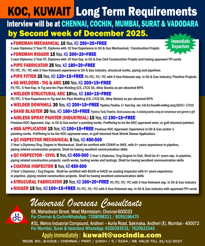 📣 Hiring for KOC Kuwait – Long-Term Projects ✅ Multiple Roles: Welders, Fabricators, Foremen, Inspectors 📍 Interview Locations: Chennai, Cochin, Mumbai, Surat, Vadodara 📅 Second Week of December 2025 📩…