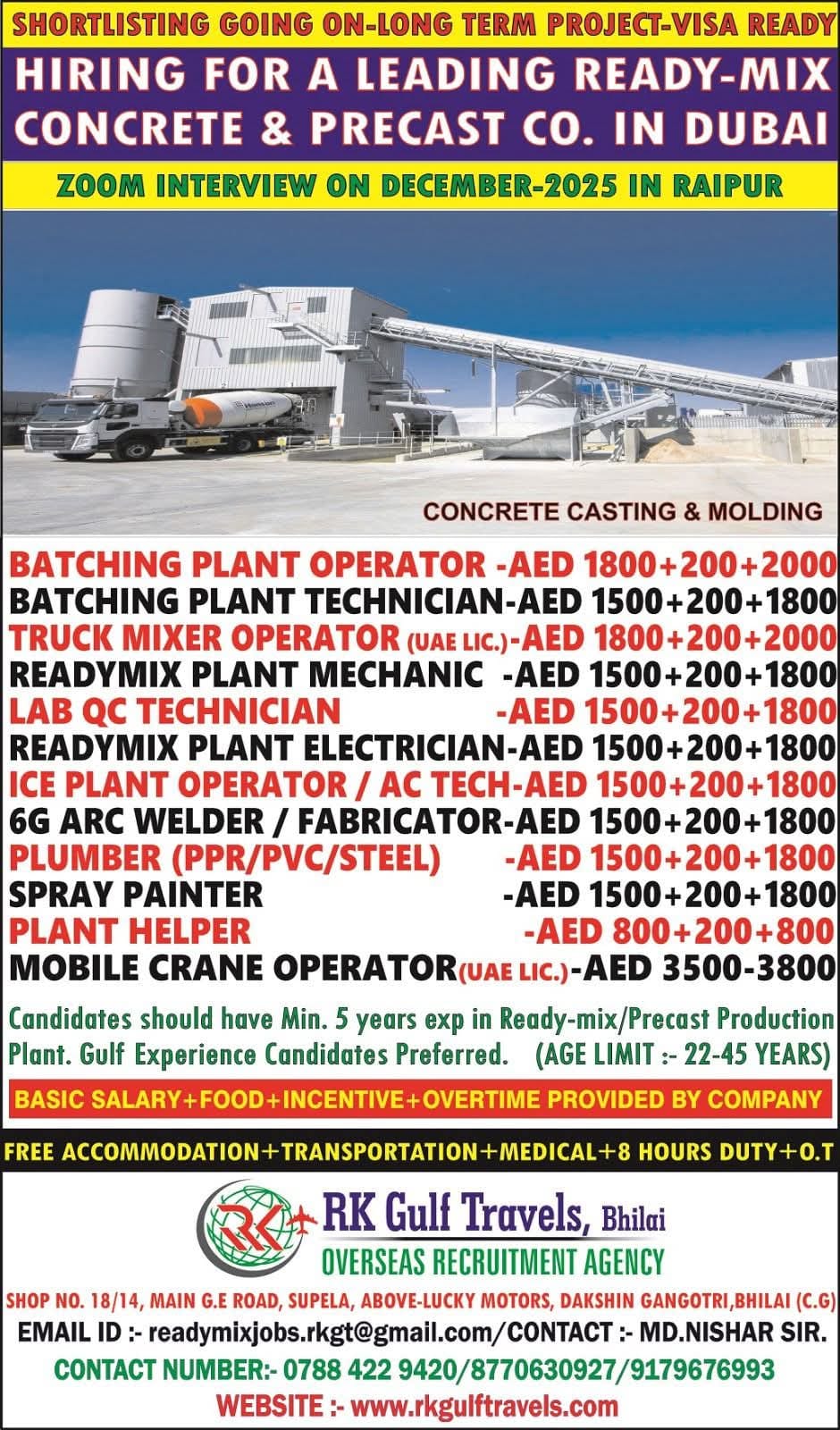 GREETINGS FROM RK GULF TRAVELS, BHILAI. HIRING FOR A LEADING READY MIX & PRECAST CO. – UAE. ZOOM MEETING INTERVIEW ON DECEMBER-2025 IN OUR OFFICE. CANDIDATES SHOULD HAVE MINIMUM 5-6…