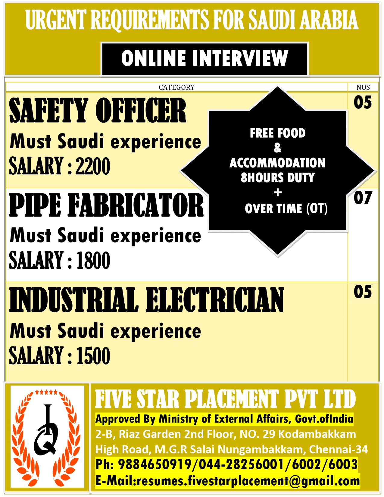 URGENT REQUIREMENT FOR SAUDI ARABIA Interested candidates can share your cv along with all credentials below Mail Id EMAIL:[email protected] CONTACT NO : 9884650919/044-28256001/28256002/28256003
