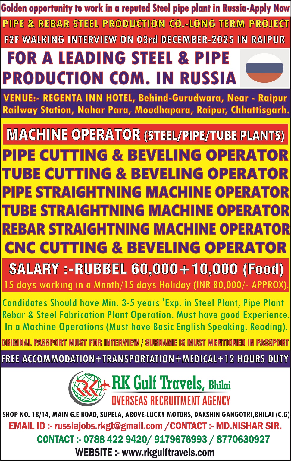 GREETINGS FROM RK GULF TRAVELS, BHILAI. HIRING FOR A LEADING STEEL & PIPE MANUFACTURING COMPANY – RUSSIA. CV SELECTION WITH CLIENT INTERVIEW ON 03RD DECEMBER -2025 IN RAIPUR. CANDIDATES SHOULD…