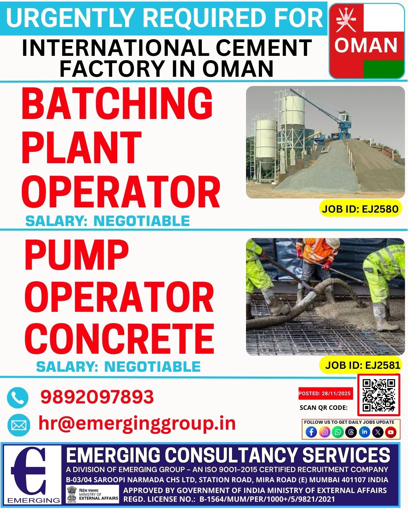URGENTLY REQUIRED FOR LEADING CEMENT FACTORY IN OMAN Positions: 1. BATCHING PLANT OPERATOR Salary : NEGOTIABLE2 . PUMP OPERATOR (CONCRETE)Salary : NEGOTIABLE How to Apply: Send your resume to: [email protected]…