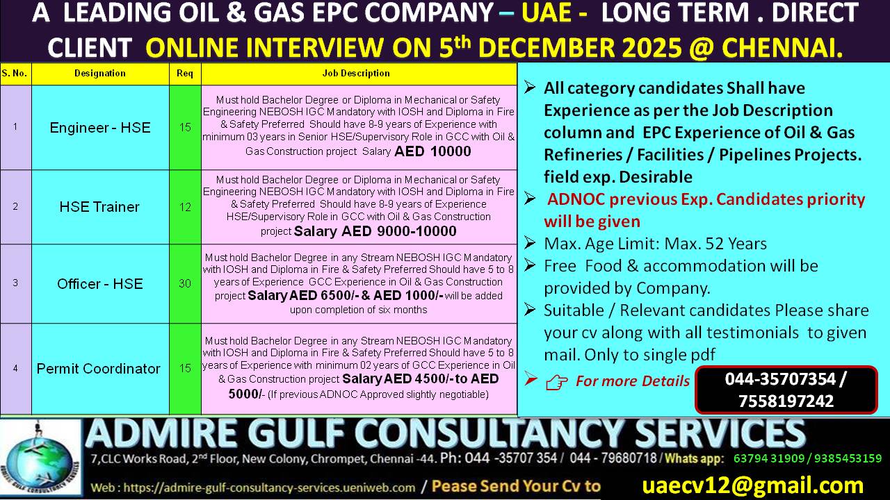 Sr. No. Designation Requirement Job Description 1 Engineer – HSE 15 Must hold Bachelor Degree or Diploma in Mechanical or Safety Engineering NEBOSH IGC Mandatory with IOSH and Diploma in…