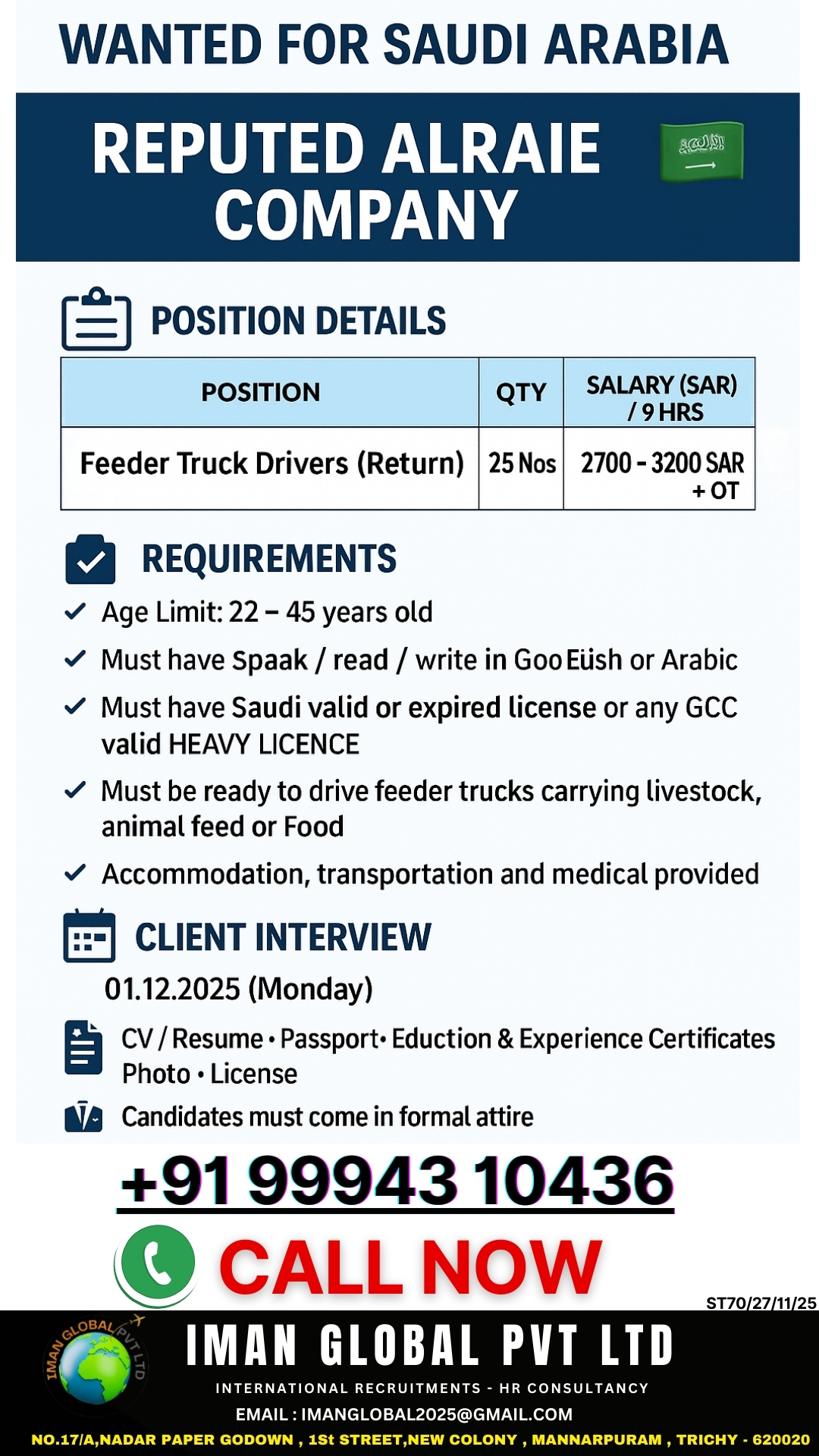 GREETINGS FROM RK GULF TRAVELS, BHILAI. HIRING FOR AYTB COMPANY FOR THEIR MAADEN ALUMUNIUM PLANT (ROLLING MILL) – KSA. F2F CLIENT INTERVIEW ON 11TH DECEMBER-2025 IN BHILAI (CHATTISHGARH). CANDIDATES SHOULD…
