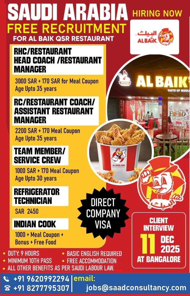 For more details: please call: 9620992294-8277795307-9845300838 Please like & join us: https://www.facebook.com/welcometosaad https://www.instagram.com/saddconsultancy_jobs/ https://t.me/saadgulfjobshttps://www.linkedin.com/in/abroadjobshttps://twitter.com/saadgulfjobs