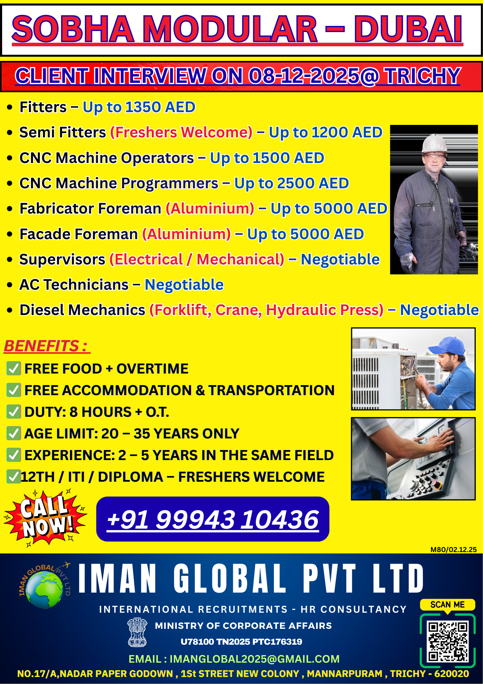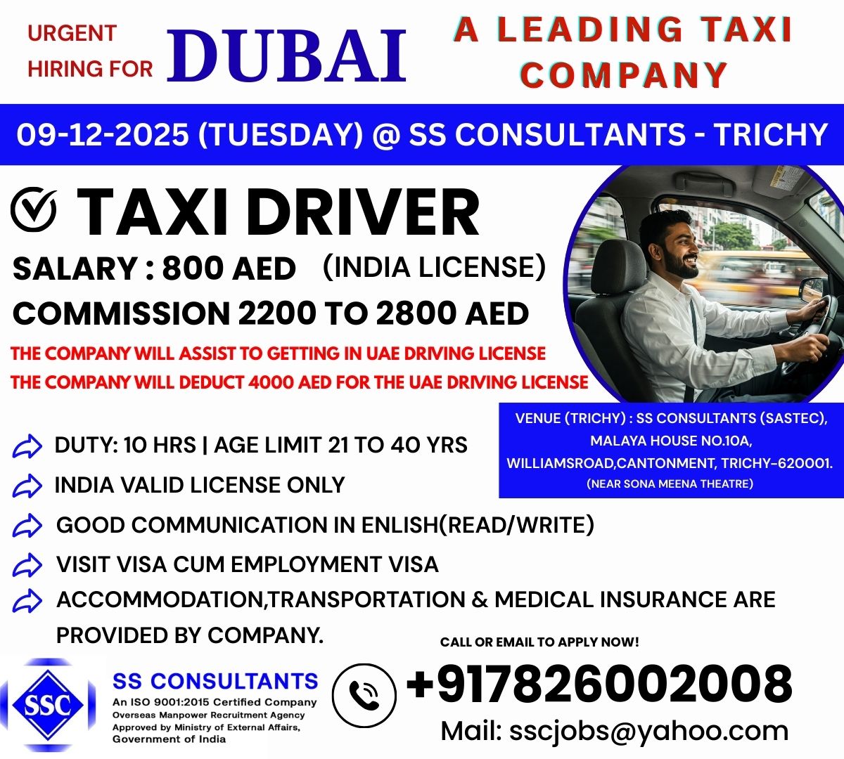 Taxi Driver for Leading Dubai Taxi Company Company: Confidential (Via Approved Recruitment Agency)Location: Dubai, UAEInterview Location: SS Consultants, Trichy, IndiaInterview Date: 09-12-2025 (Tuesday)Job Type: Full-timeSalary: 800 AED Basic Salary +…