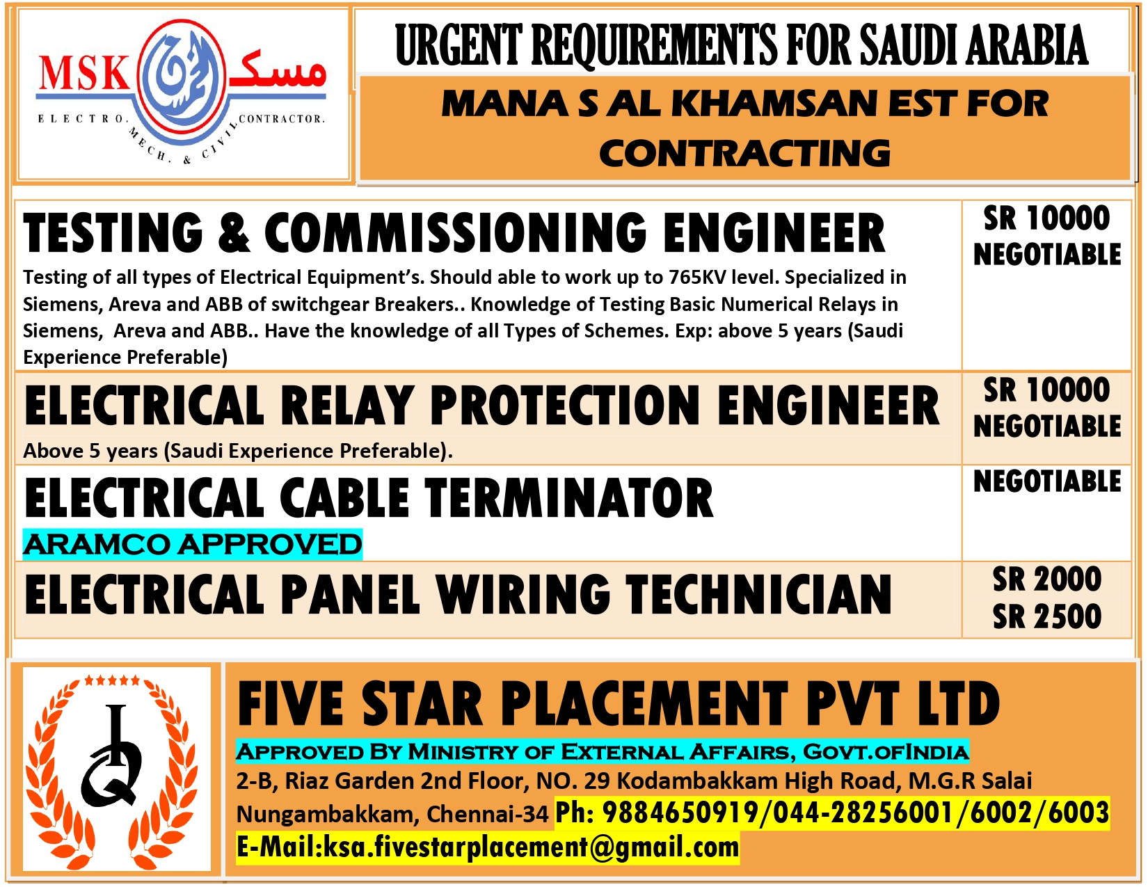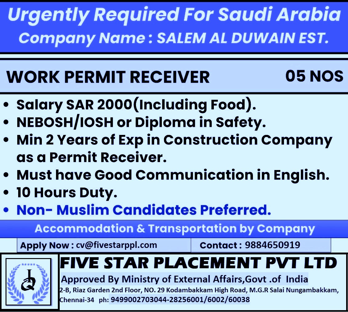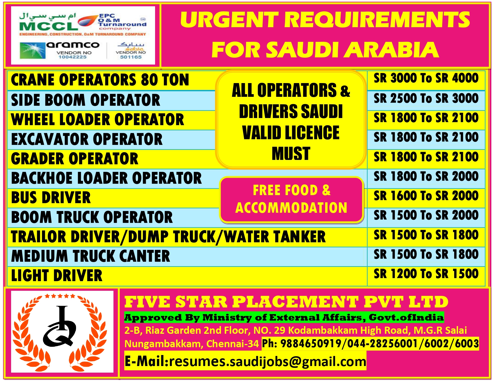 URGENT REQUIREMENT FOR SAUDI ARABIA Interested candidates can share your cv along with all credentials below Mail Id EMAIL:[email protected] CONTACT NO : 9884650919/044-28256001/28256002/28256003