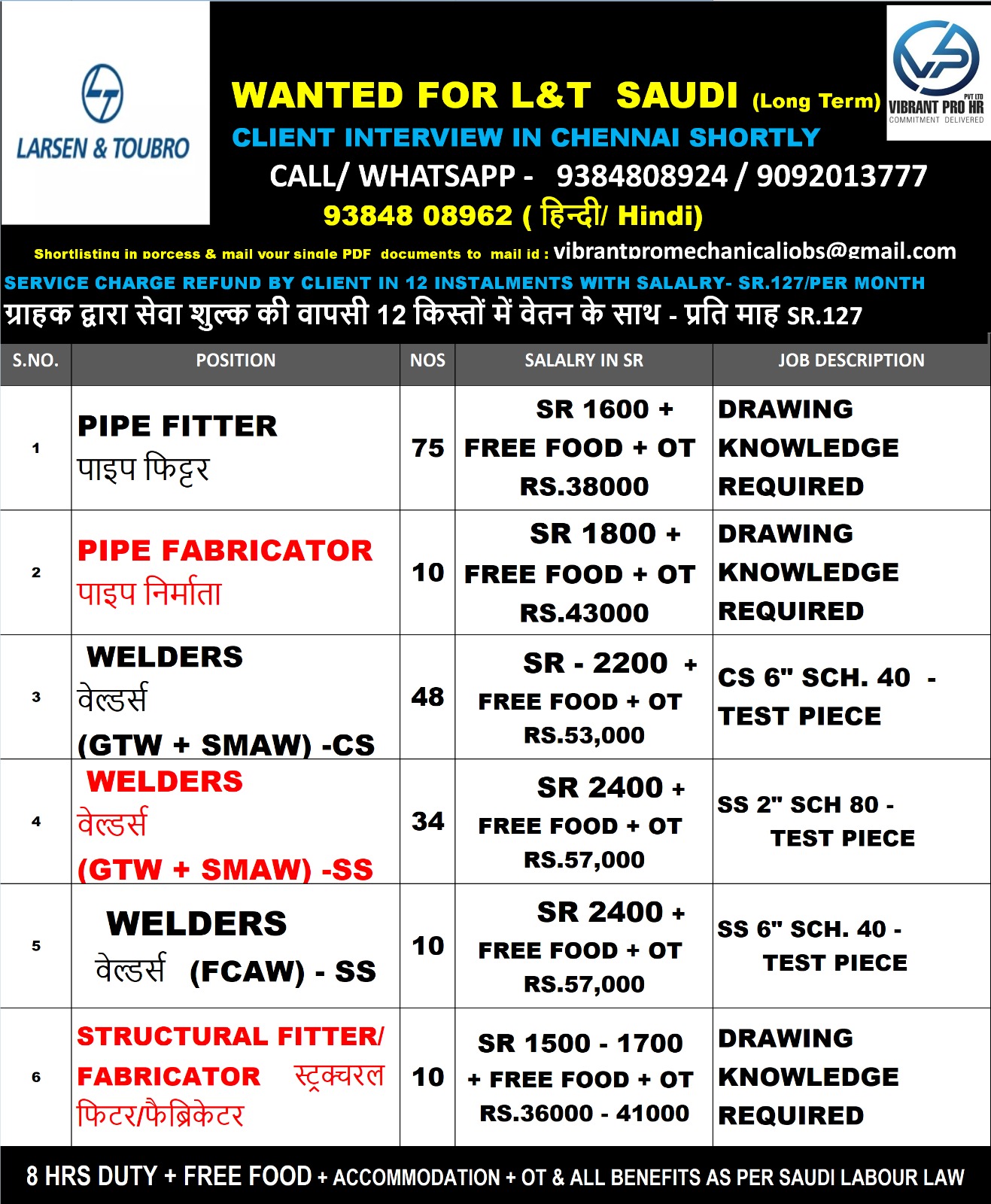 S.NO. POSITION NOS SALALRY IN SR JOB DESCRIPTION 1 PIPE FITTER पाइप फिट्टर 75 SR 1600 + FREE FOOD + OT RS.38000 DRAWING KNOWLEDGE REQUIRED 2 PIPE FABRICATOR पाइप निर्माता…