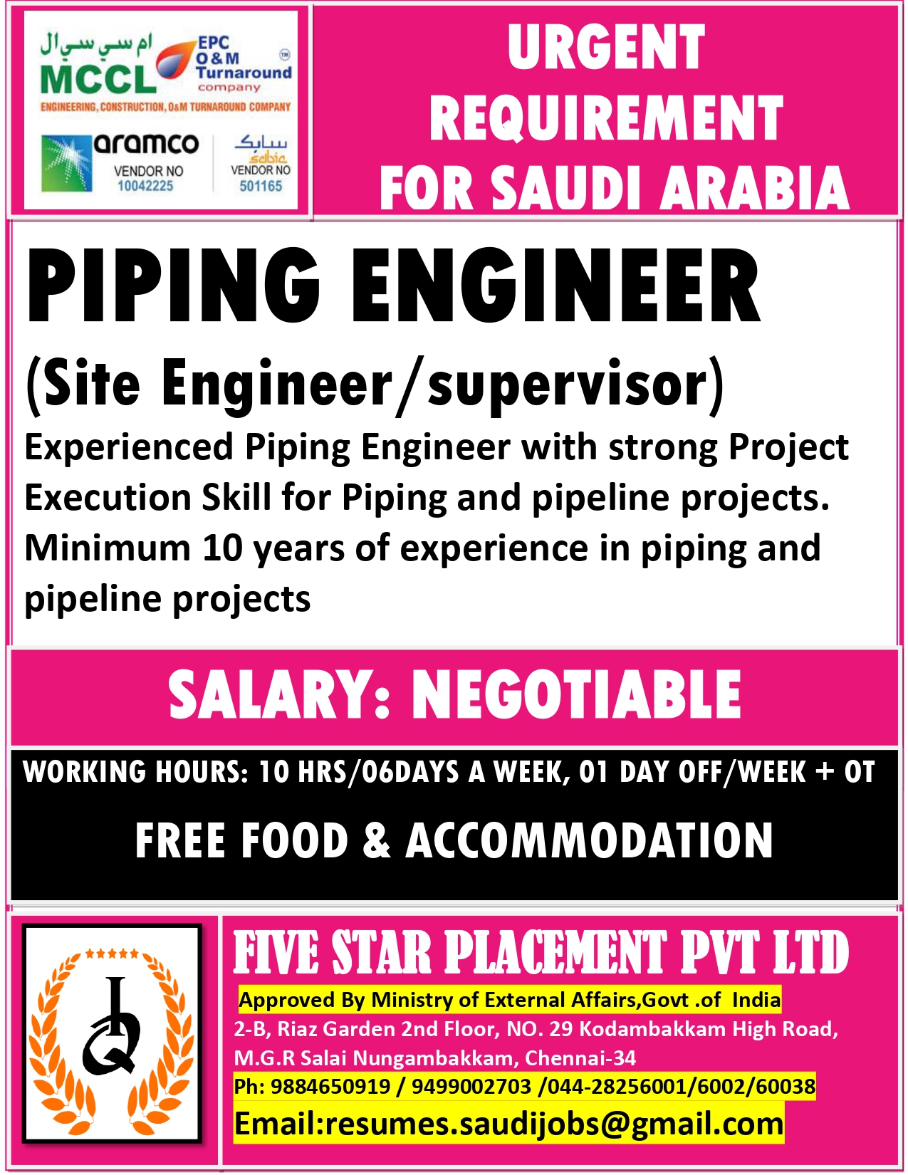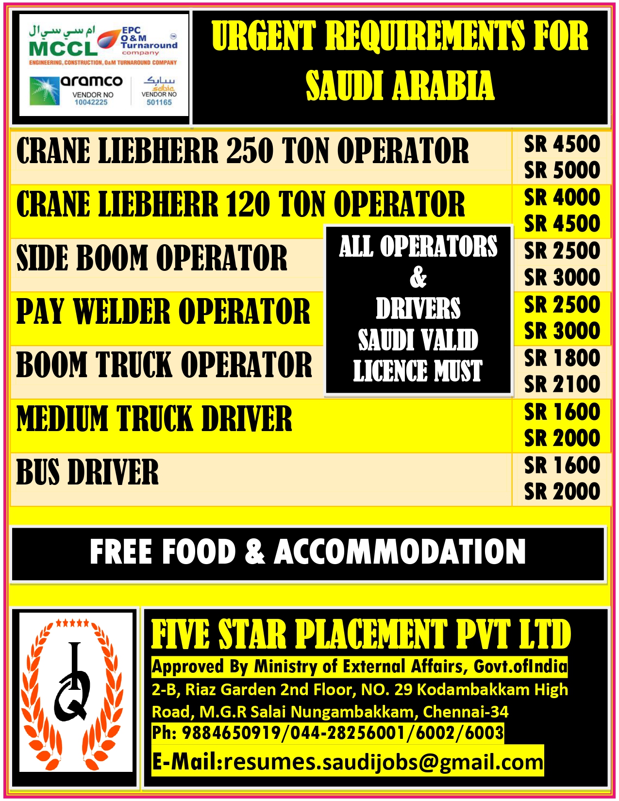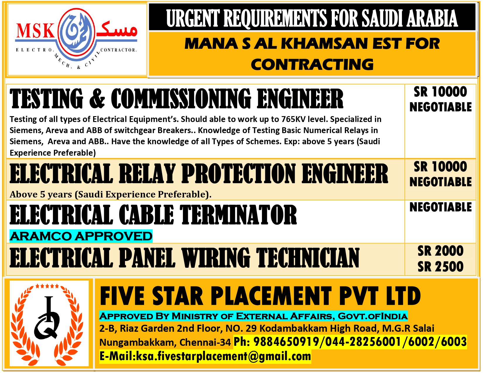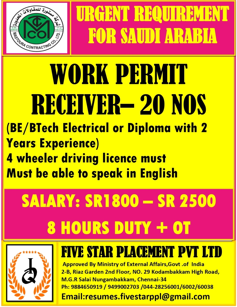 URGENT REQUIREMENT FOR SAUDI ARABIA Interested candidates can share your cv along with all credentials below Mail IdEMAIL:[email protected] NO : 9884650919/044-28256001/28256002/28256003