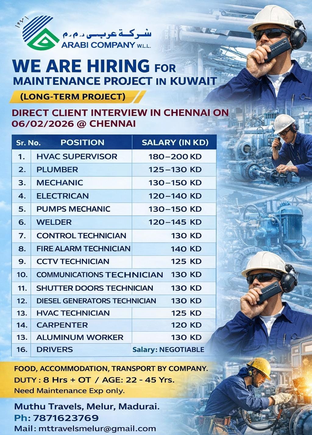 KUWAIT – MAINTENANCE PROJECT 📌INDIAN OR GULF EXP ONLY APPLY 🧲CLIENT INTERVIEWON :06-02-2026@ CHENNAI More Details Contactவிருப்பமுள்ளவர்கள் தொடர்பு கொள்ளவும் Whatsapp/ Contact us :88075 34697 E-MAIL: [email protected]