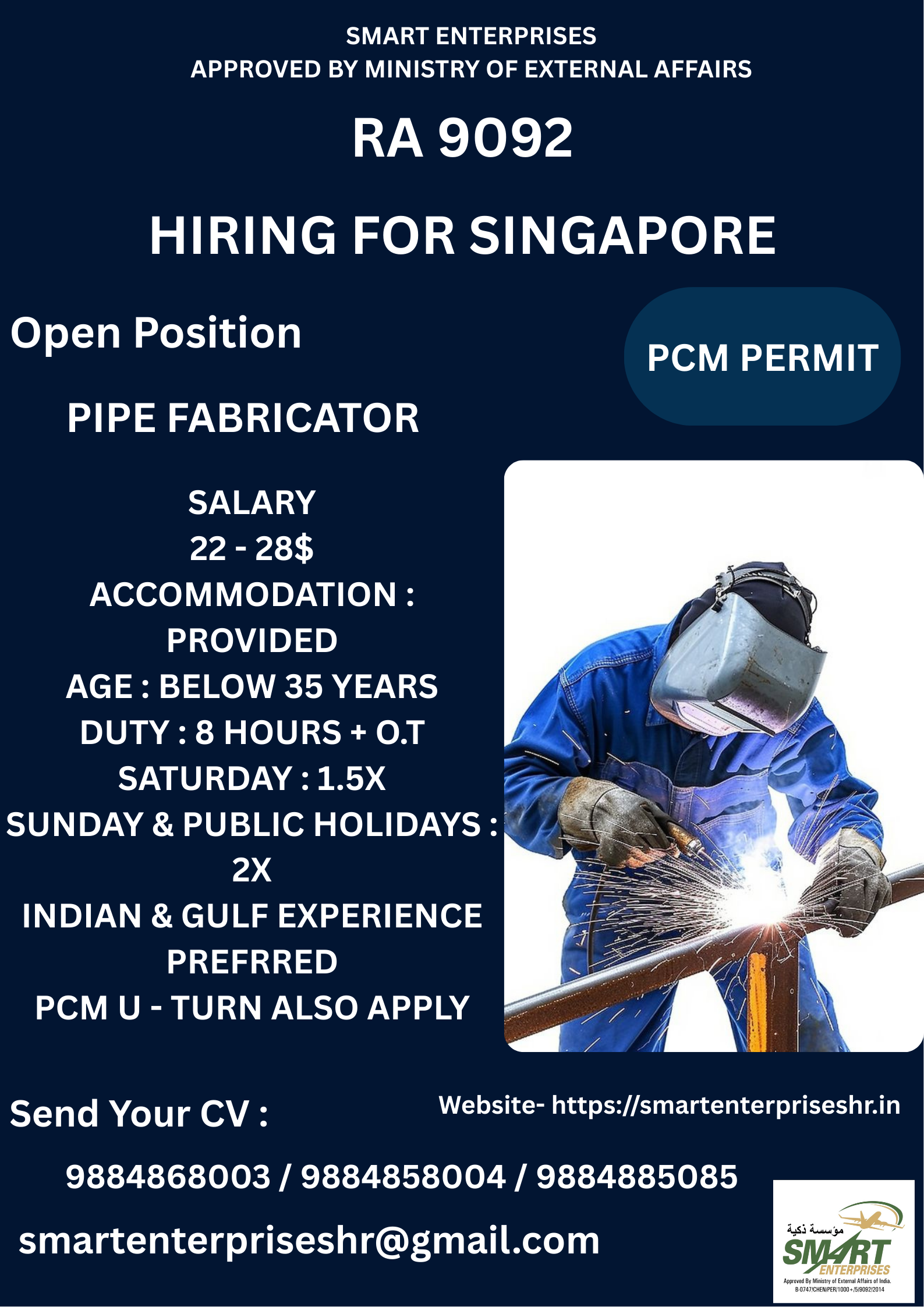 HIRING FOR SINGAPOREJAPANESE OIL & GAS MAIN CONTRACTORPCM PERMITOpen PositionPIPE FABRICATORSALARY22 – 28$ACCOMMODATION : PROVIDEDAGE : BELOW 35 YEARSDUTY : 8 HOURS + O.TSATURDAY : 1.5XSUNDAY & PUBLIC HOLIDAYS :…