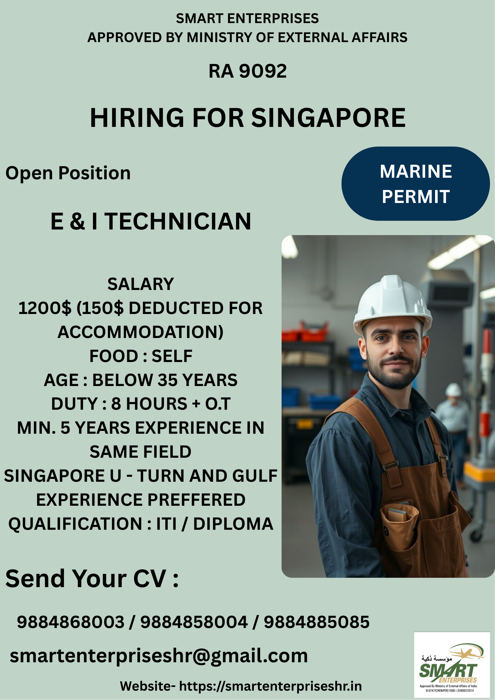 HIRING FOR SINGAPOREMARINE PERMITOpen PositionE & I TECHNICIANSALARY1200$ (150$ DEDUCTED FOR ACCOMMODATION)FOOD : SELFAGE : BELOW 35 YEARSDUTY : 8 HOURS + O.TMIN. 5 YEARS EXPERIENCE IN SAME FIELDSINGAPORE U…