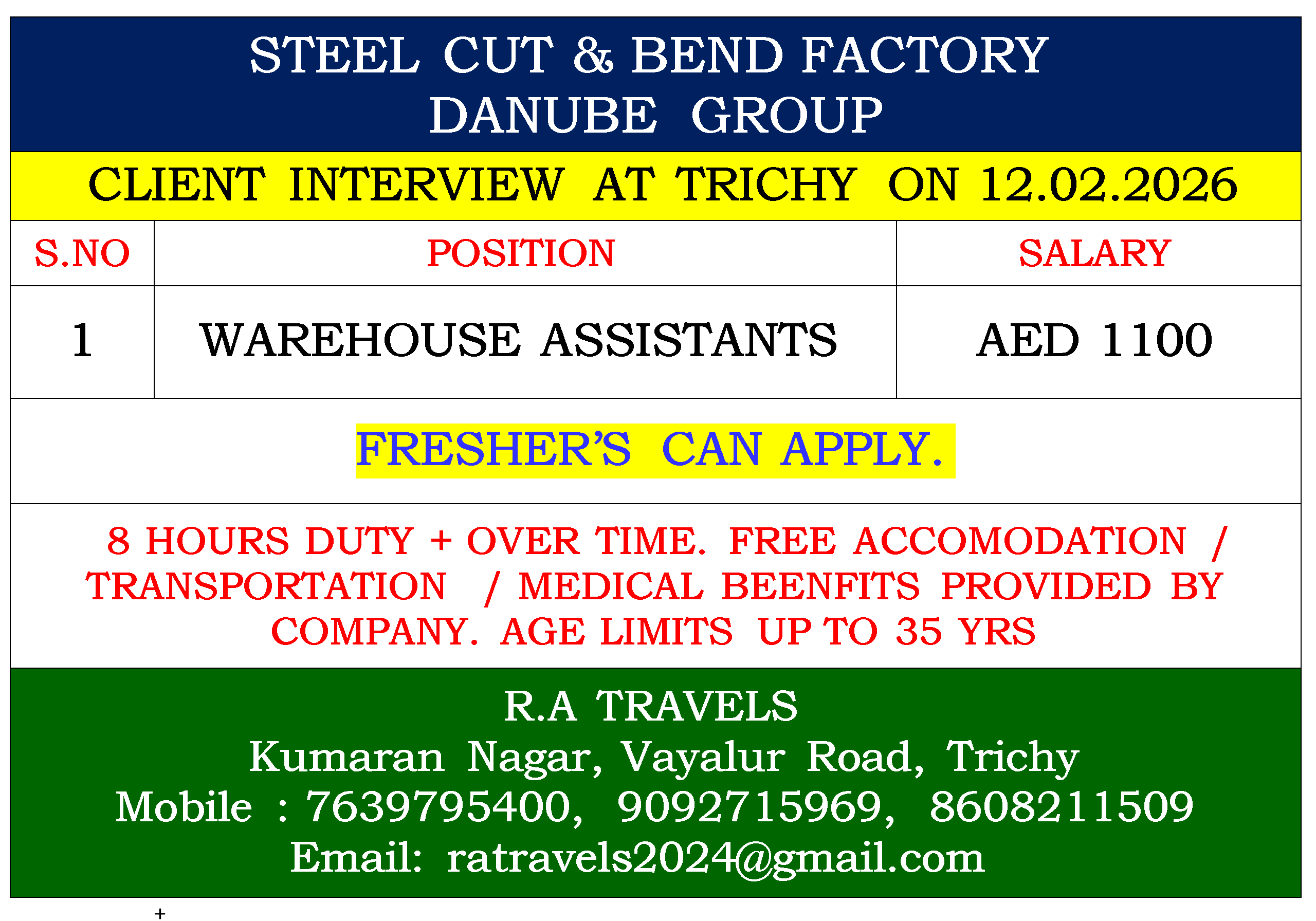 STEEL CUT & BEND FACTORY DANUBE GROUP CLIENT INTERVIEW AT TRICHY ON 12.02.2026 S.NO POSITION SALARY 1 WAREHOUSE ASSISTANTS AED 1100 FRESHER’S CAN APPLY. 8 HOURS DUTY + OVER TIME.…
