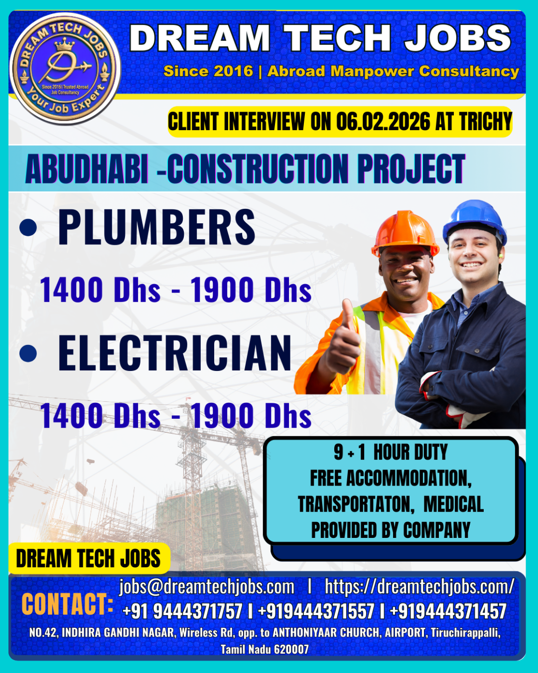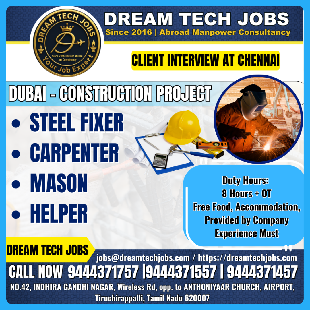 A LEADING GROUP OF CONSTRUCTION COMPANY – UAE DIRECT CLIENT INTERVIEW AT TRICHY ON 07.02.2026 S.NO POSITION SALARY 1 CIVIL FOREMAN BASED ON EXP AND INTERVIEW PERFOMANCE 2 AC TECHNICIAN…