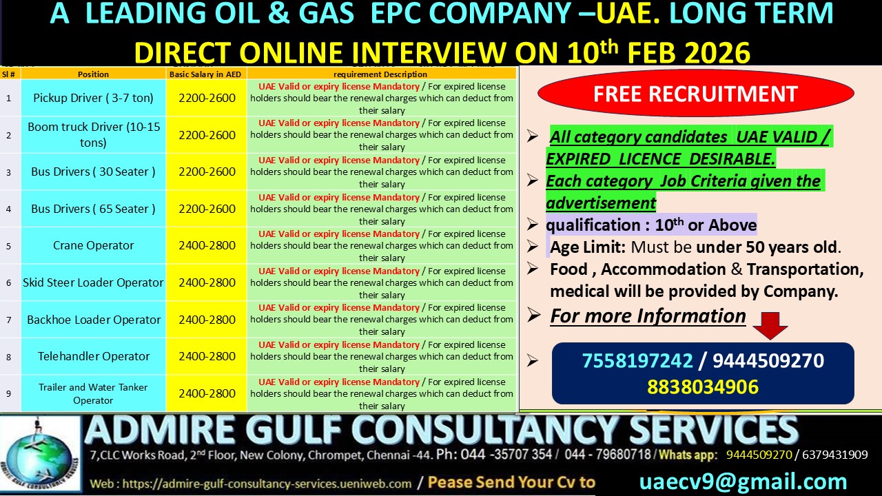 a recruitment drive for heavy vehicle drivers and equipment operators for a Leading Oil & Gas EPC Company based in the UAE . This is a “Free Recruitment,” meaning you shouldn’t be charged a placement fee by the agency.