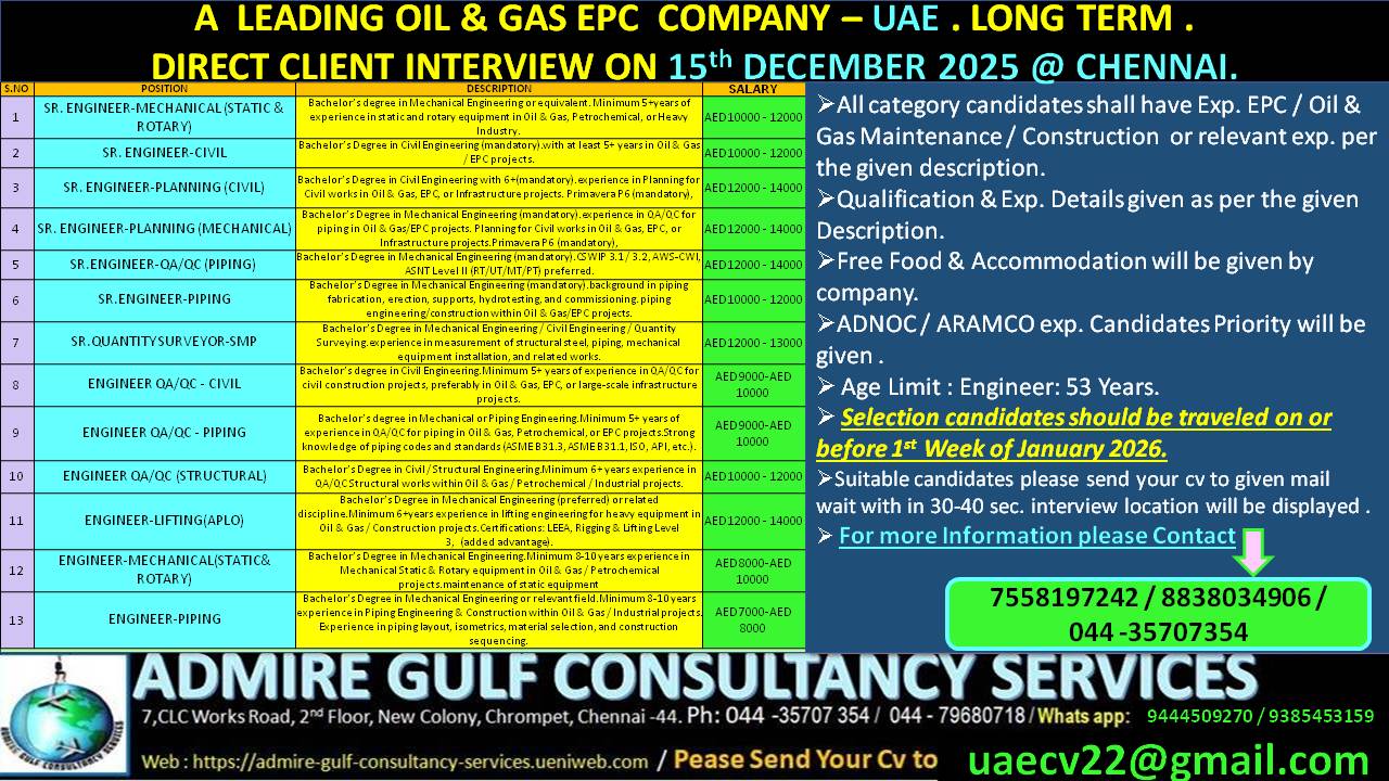 | 14 | ENGINEER-STRUCTURAL | Bachelor’s degree in Civil or Structural Engineering.Minimum 5–8 years of experience in structural engineering for Oil & Gas EPC or contracting projects. | AED 8000-AED 10000 |