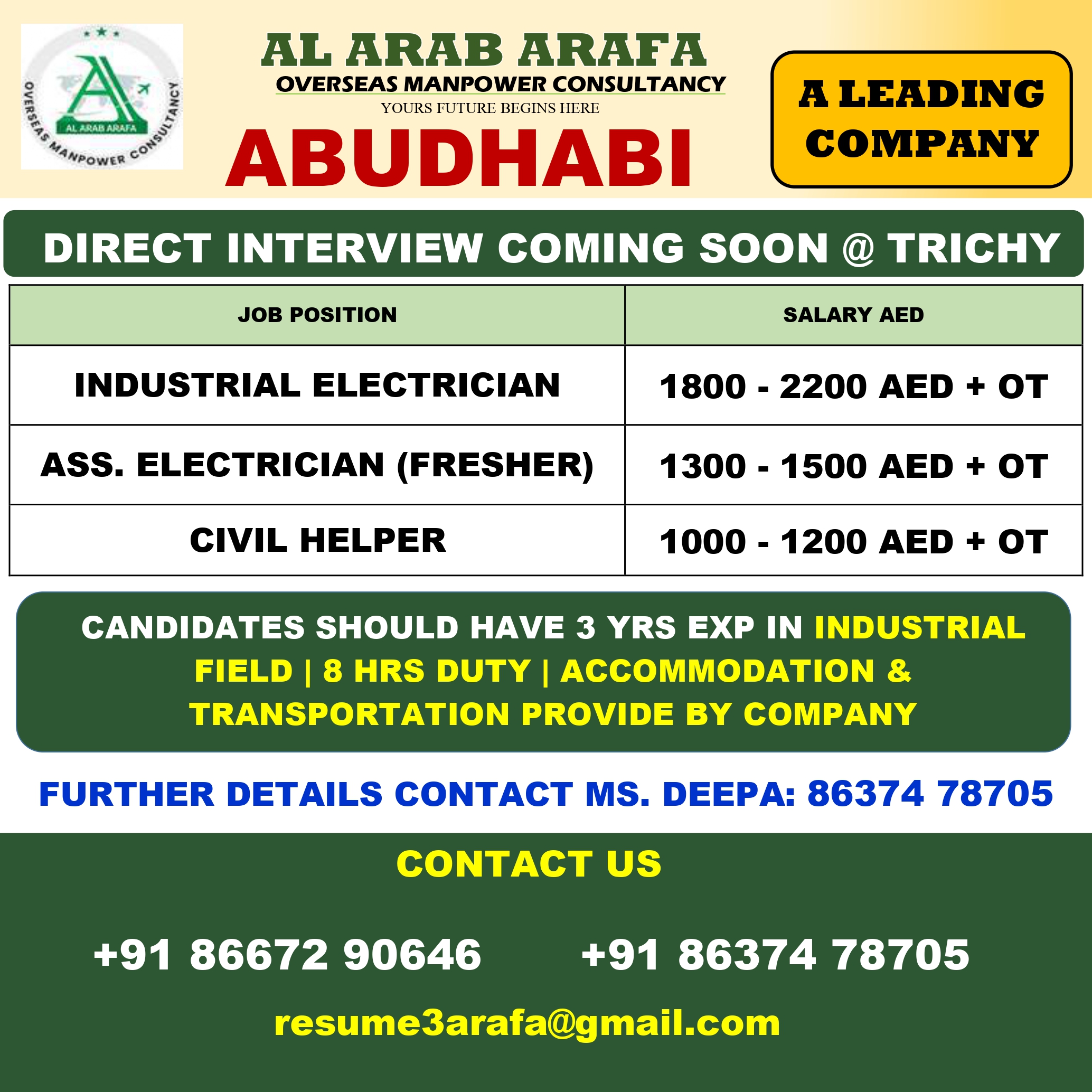 FURTHER DETAILS KINDLY CONTACT MRS.DEEPA: 86374 78705