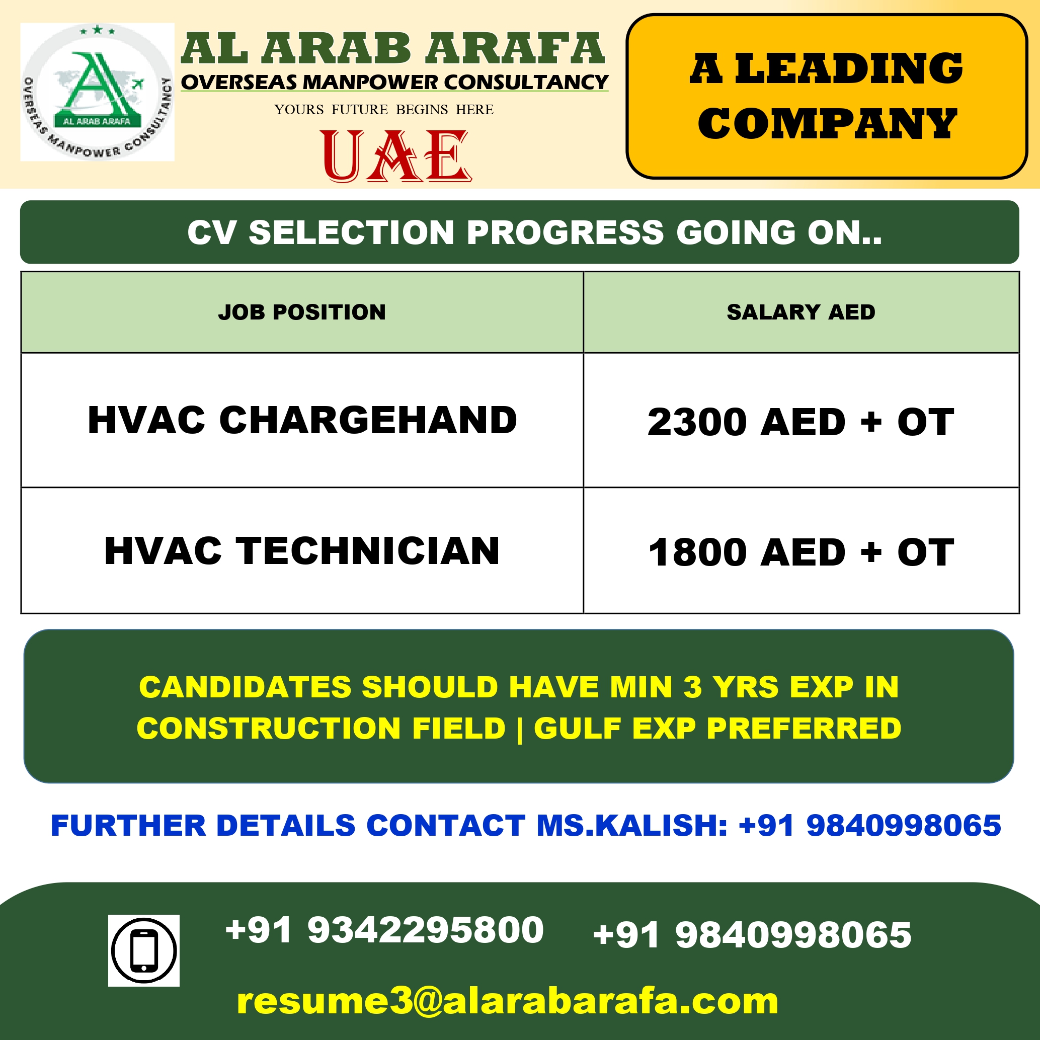 FURTHER DETAILS CONTACT MS.KALISH – 9840998065
