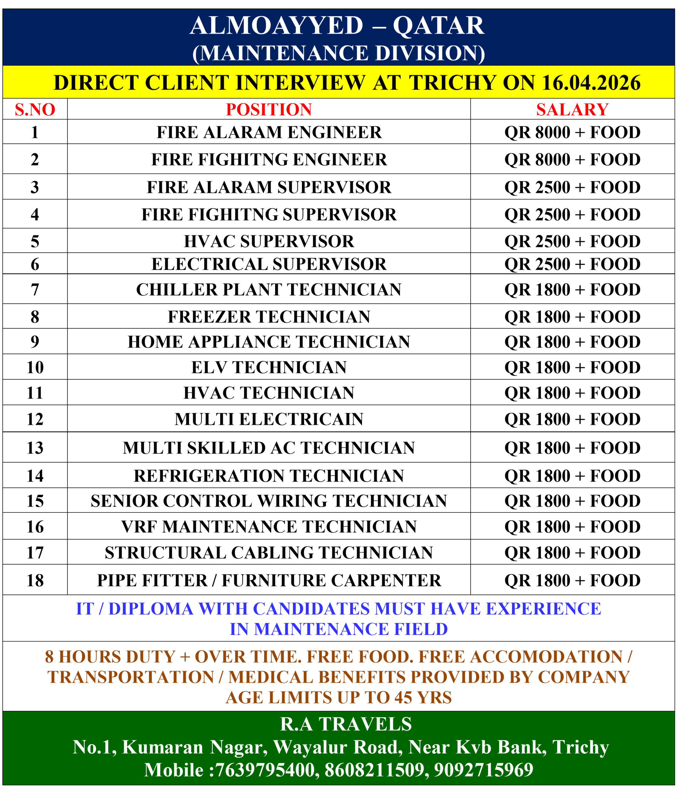 8 HOURS DUTY + OVER TIME. FREE FOOD. FREE ACCOMODATION / TRANSPORTATION / MEDICAL BENEFITS PROVIDED BY COMPANY AGE LIMITS UP TO 45 YRS |