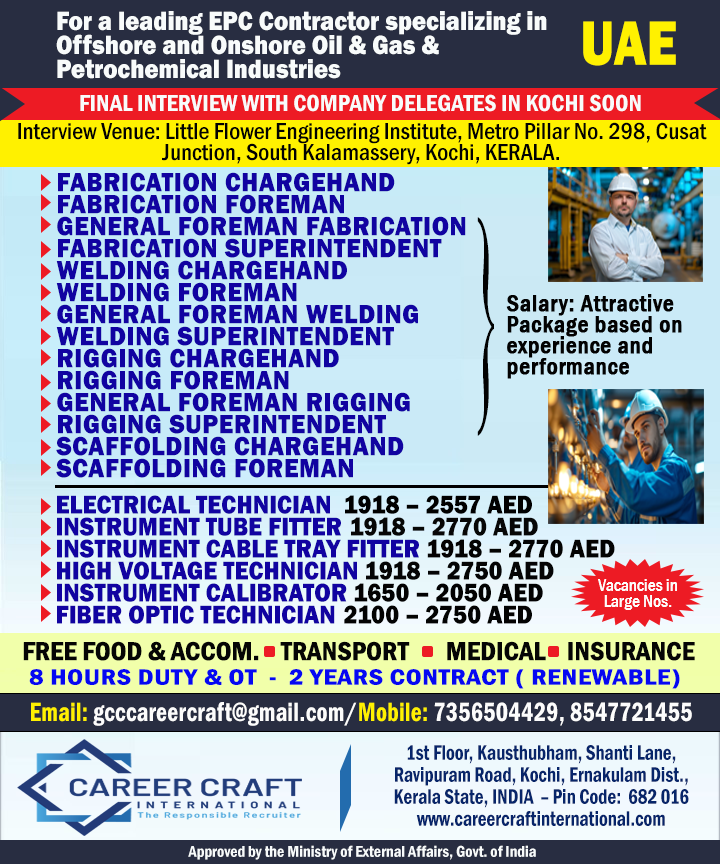 A leading EPC Contractor specializing in Offshore and Onshore Oil & Gas & Petrochemical Industries based in Abu Dhabi conducts a direct client interview at Kochi shortly. Interested candidates are requested to send their applications urgently.