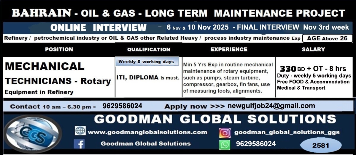 Apply NowBAHRAIN OIL & GAS LONG TERM MAINTENANCE PROJECT MECHANICAL ROTATING TECHNICIAN ONLINE INTERVIEW 6 nov 2025 & 10 nov 2025 – final interview nov 3rd week CANDIDATES SHOULD HAVE MIN 3 -5 YR EXP IN RELEVANT EXP MANDATORY CONTACT – 7200630154 APPLY NOW>>> [email protected] 330 BHD + 8 HRS DUTY + OT – […]