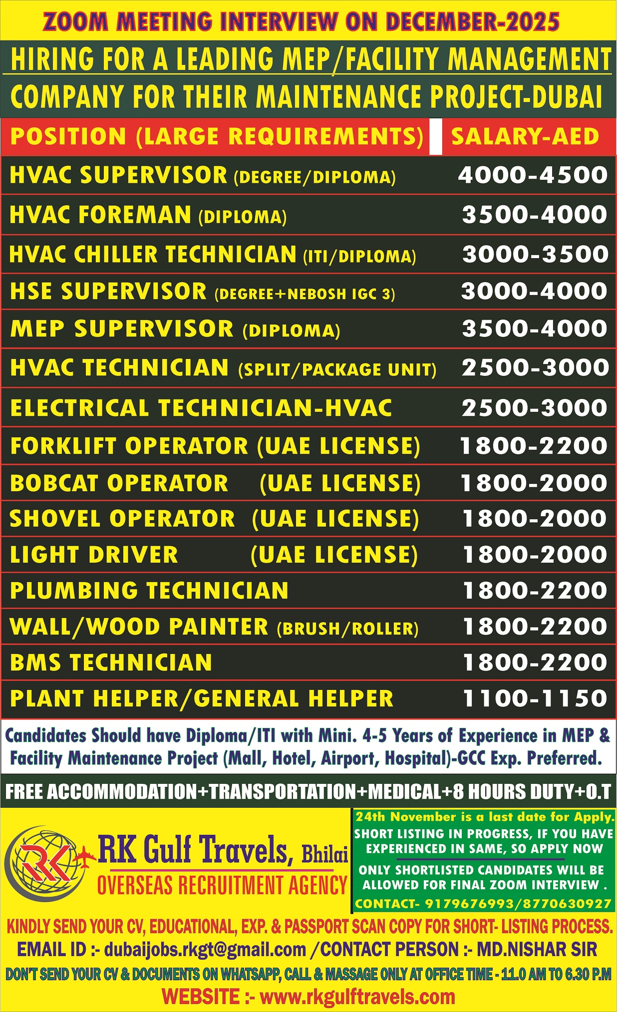 GREETINGS FROM RK GULF TRAVELS, BHILAI. HIRING FOR A LEADING FACILITY MAINTENANCE/MEP CO. – UAE CV SELECTION WITH ZOOM INTERVIEW ON DECEMBER -2025 IN OUR OFFICE. CANDIDATES SHOULD HAVE MINIMUM…