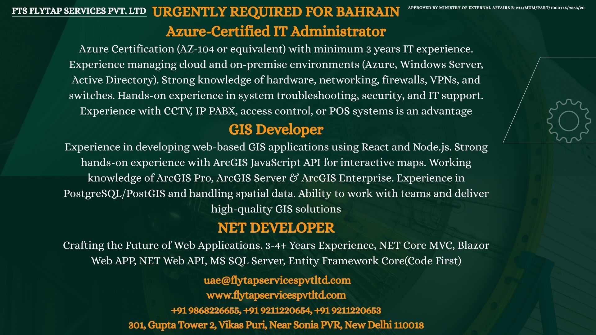 Urgently Required for Bahrain – IT & Technology Specialists FTS Flytap Services Pvt. Ltd. invites applications from highly skilled IT and technology professionals for urgent openings in Bahrain with reputed…