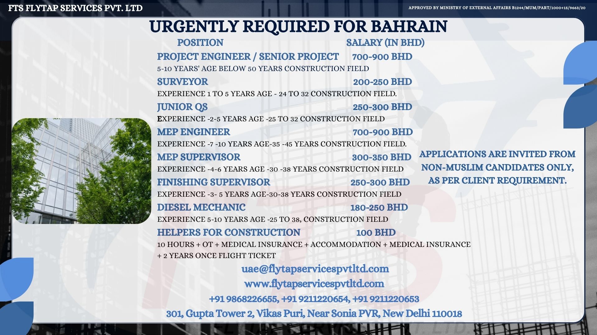Urgently Required for Bahrain – Construction & Engineering Professionals FTS Flytap Services Pvt. Ltd. invites applications from experienced construction and engineering professionals for multiple positions in Bahrain with reputed construction…