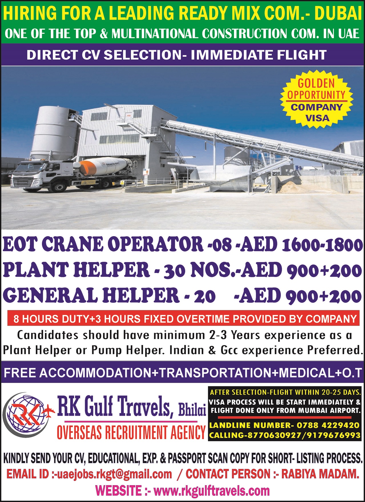 GREETINGS FROM RK GULF TRAVELS, BHILAI. HIRING FOR A LEADING READYMIX & PRECAST PRODUCTION COMPANY – UAE DIRECT CV SELECTION – IMMEDIATE FLIGHT IN JANUARY 2026. CANDIDATES SHOULD HAVE MINIMUM…