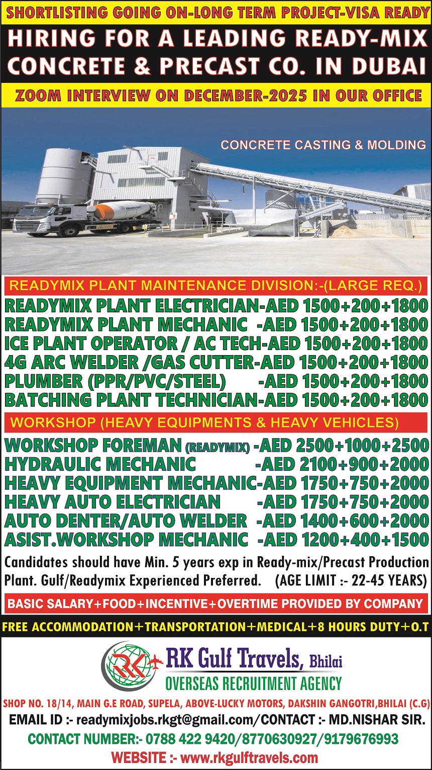 GREETINGS FROM RK GULF TRAVELS, BHILAI. HIRING FOR A LEADING READYMIX & PRECAST PRODUCTION COMPANY – UAE CV SELECTION WITH ZOOM INTERVIEW ON DECEMBER -2025 IN OUR OFFICE. CANDIDATES SHOULD…