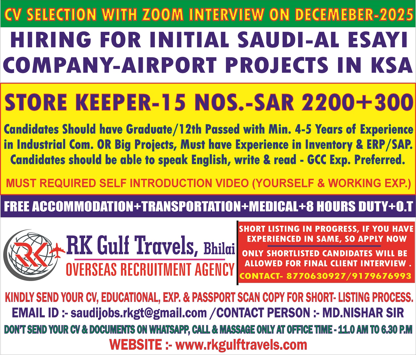 GREETINGS FROM RK GULF TRAVELS, BHILAI. HIRING FOR A LEADING COMPANY FOR THEIR AIRPORT PROJECTS – KSA. CV SELECTION WITH ZOOM INTERVIEW ON DECEMBER -2025 IN OUR OFFICE. CANDIDATES SHOULD…
