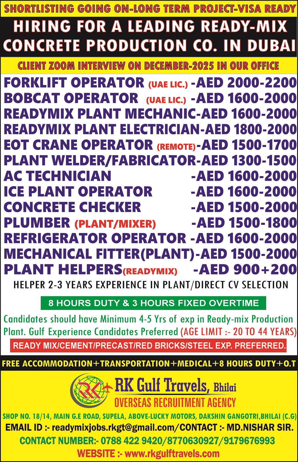GREETINGS FROM RK GULF TRAVELS, BHILAI. HIRING FOR A LEADING READYMIX & PRECAST PRODUCTION COMPANY – UAE CV SELECTION WITH ZOOM INTERVIEW ON DECEMBER -2025 IN OUR OFFICE. CANDIDATES SHOULD…