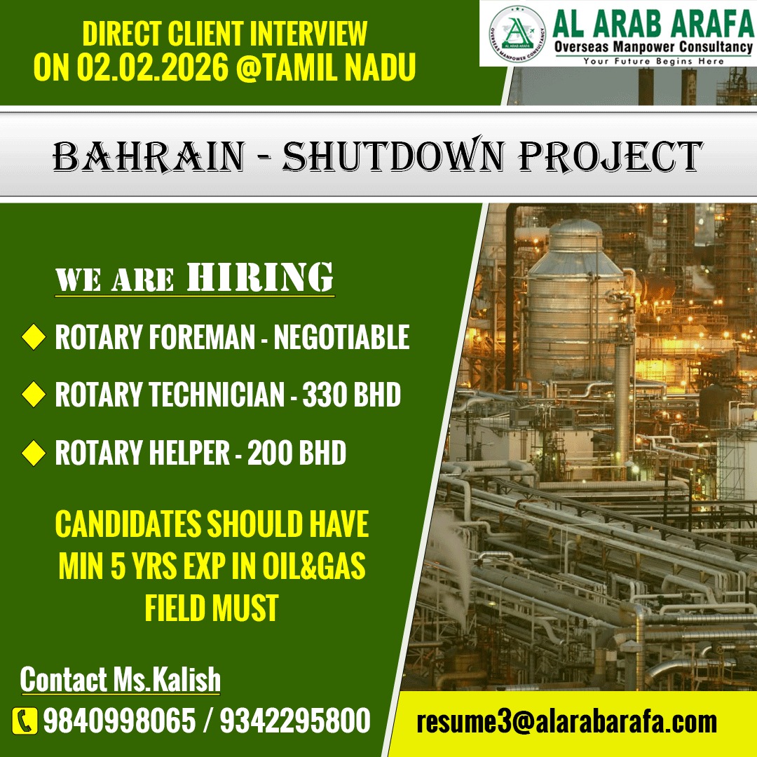 HIRING FOR BAHRAINopen positionA.C TECHNICIANSALARY160 – 200 BHD + O.TAGE : BELOW 40 YEARSACCOMMODATION AND TRANSPORATION : PROVIDEDDUTY HOURS : 8 HOURSQUALIFICATION : ITI / DIPLOMA IN AIRCONDITONING & REFRIGERATION…