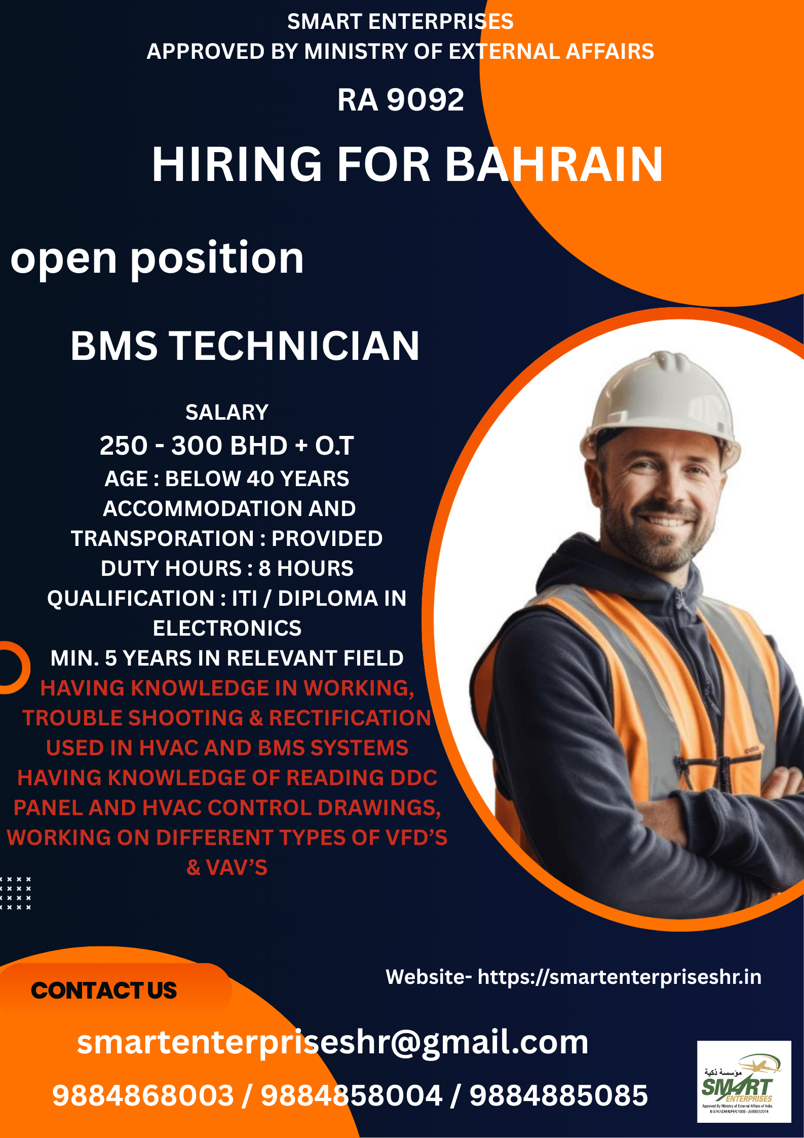 HIRING FOR BAHRAINPOSITIONHVAC TECHNICIANSALARY140 BHD + 3.5% DAILY COMMISSION + 3 BHD (MOBILE ALLOWANCE)ACCOMMODATION : PROVIDEDAGE : BELOW 40 YEARSDUTY HOURS : 8 HOURS + O.TMIN. 3 YEARS EXPERIENCEContact Us9884868003…
