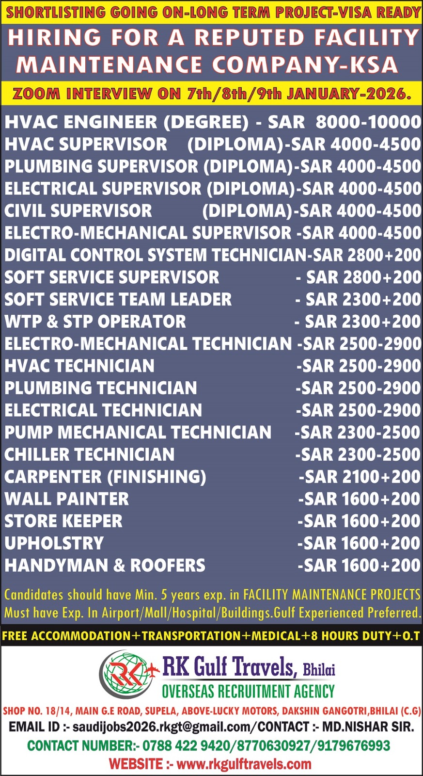 GREETINGS FROM RK GULF TRAVELS, BHILAI. HIRING FOR A LEADING & BIGGEST FACILITY MAINTENANCE COMPANY – KSA DIRECT CV SELECTION WITH ZOOM MEETING INTERVIEW ON 07TH/08TH/09TH JANUARY-2026. CANDIDATES SHOULD HAVE…