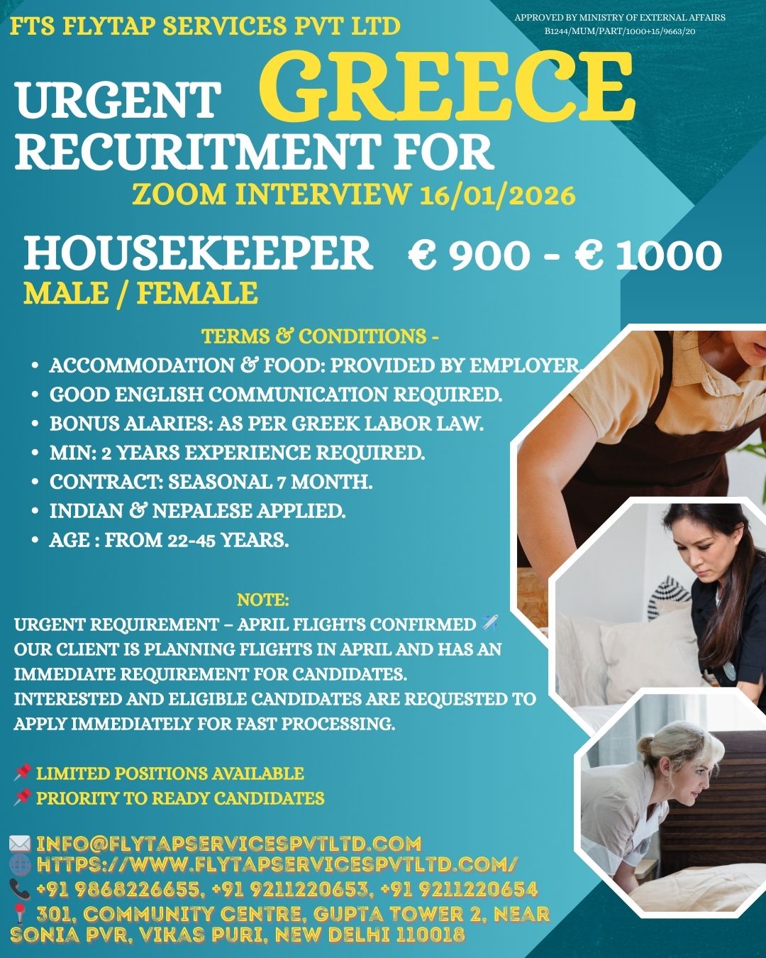 URGENT HIRING FOR GREECE – HOUSEKEEPER (MALE / FEMALE)ONLINE ZOOM INTERVIEW ON 16/01/2026APRIL FLIGHTS CONFIRMED ✈️ FTS Flytap Services Pvt Ltd is pleased to announce an urgent recruitment drive for…