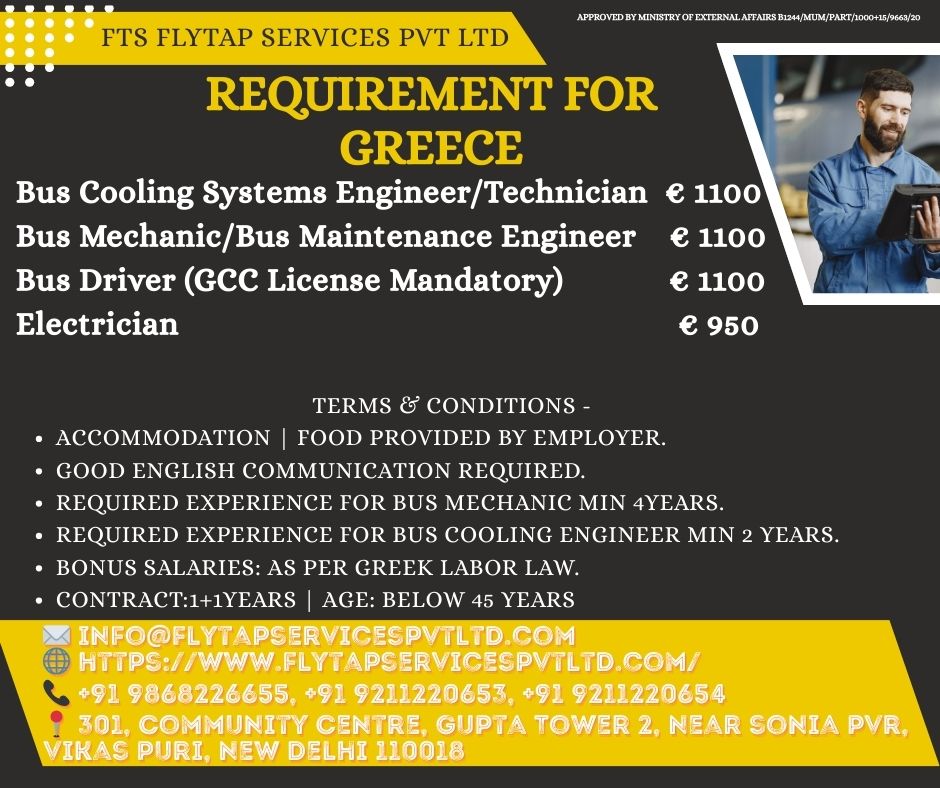 URGENT HIRING FOR GREECE – TRANSPORT & BUS MAINTENANCE PROJECT FTS Flytap Services Pvt Ltd is inviting applications for a reputed Greece-based Bus Transport & Maintenance Project. We are looking…