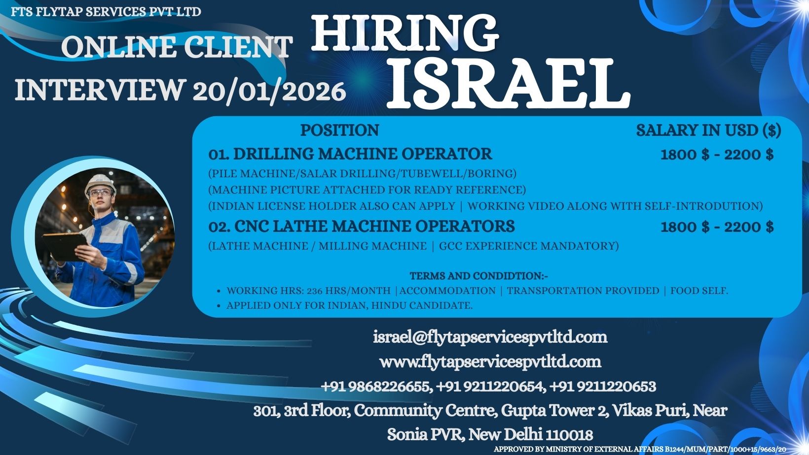 ISRAEL – URGENT HIRING | ONLINE ZOOM INTERVIEW (20/01/2026) FTS Flytap Services Pvt Ltd is urgently hiring skilled and experienced candidates for a reputed Israel Infrastructure & Industrial Project. This…