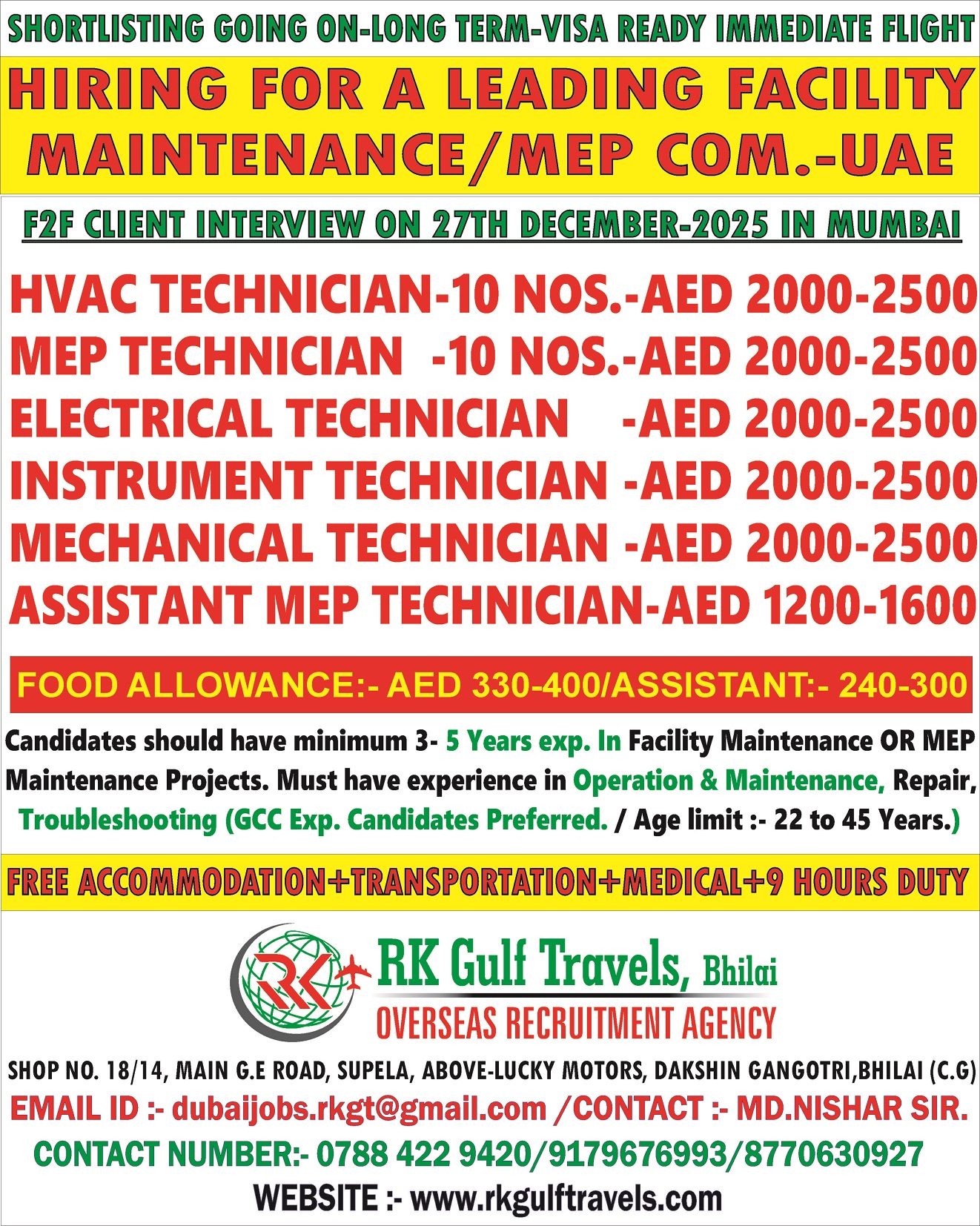 GREETINGS FROM RK GULF TRAVELS, BHILAI. HIRING FOR A LEADING FACILITY MAINTENANCE/MEP CO. – UAE FACE TO FACE CLIENT INTERVIEW ON 27TH DECEMBER -2025 IN MUMBAI. CANDIDATES SHOULD HAVE MINIMUM…