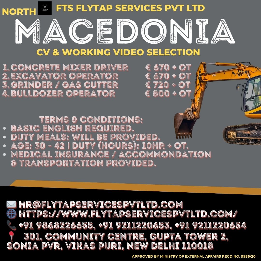 Urgent International Hiring – North MacedoniaSelection Mode: CV + Working Video (Mandatory) FTS Flytap Services Pvt Ltd is inviting skilled and experienced candidates for multiple technical and heavy-equipment roles for…