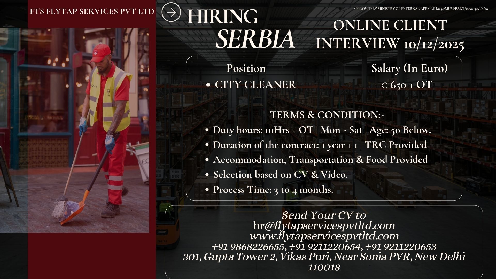 📢 Professional Hiring Prompt – Serbia (City Cleaner) Immediate Hiring – City Cleaner (Serbia)Salary: €650 + Overtime | CV + Work Video Required Flytap Services Pvt. Ltd. brings a new…