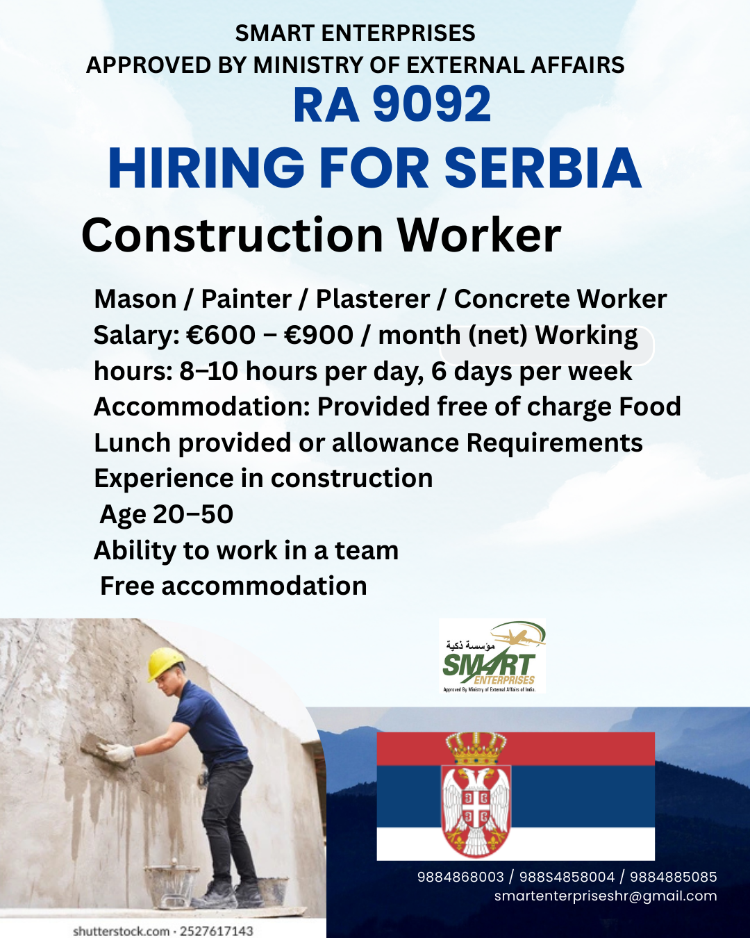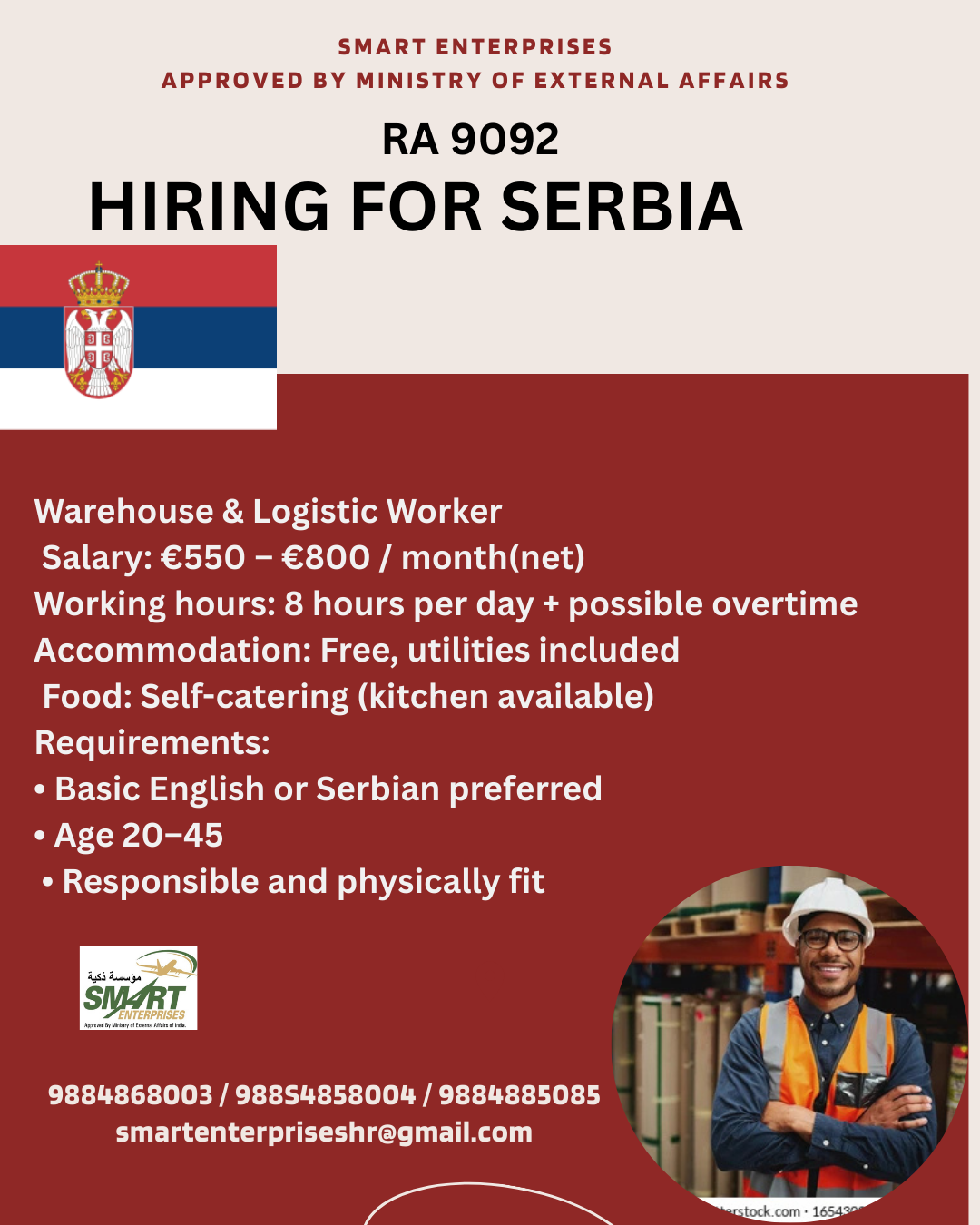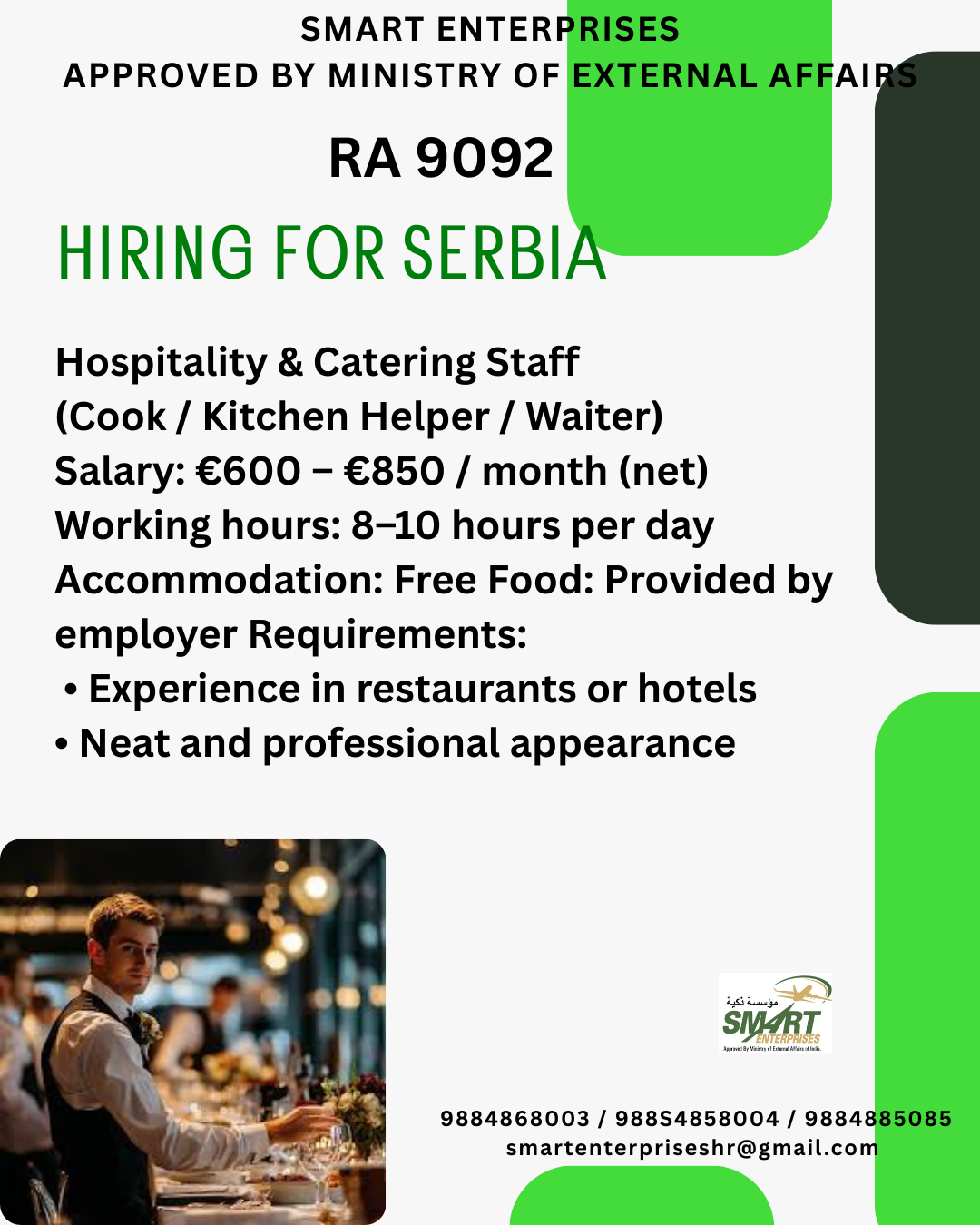 RA 9092 HIRING FOR SERBIA Hospitality & Catering Staff (Cook / Kitchen Helper / Waiter) Salary: €600 – €850 / month (net) Working hours: 8–10 hours per day Accommodation: Free…
