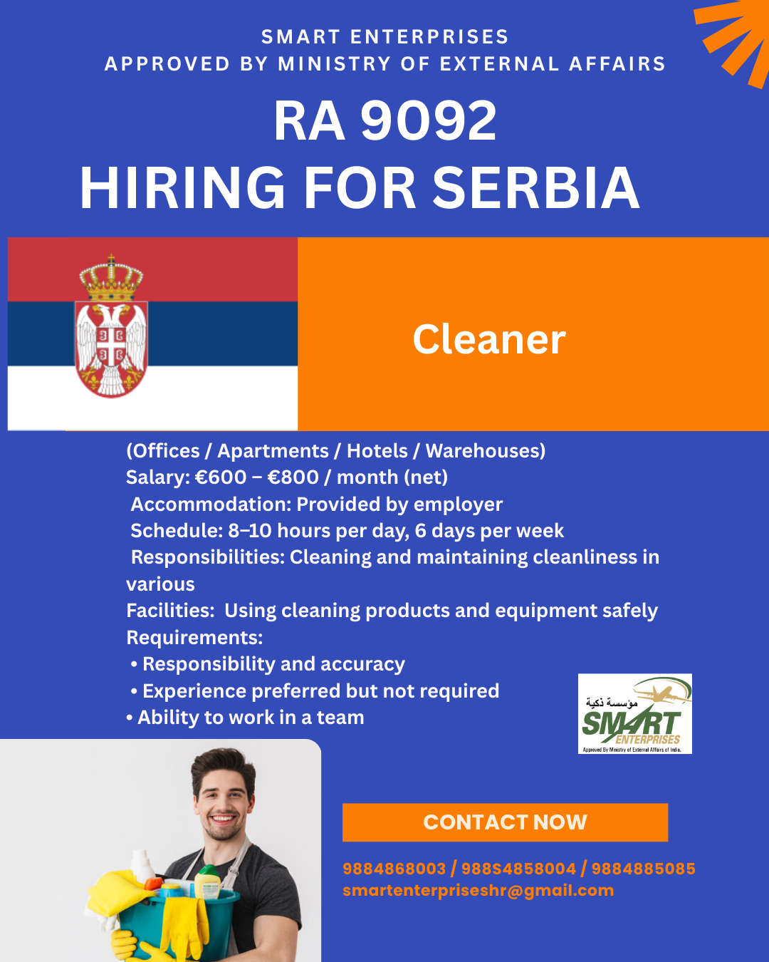 HIRING FOR SERBIA RA 9092 Cleaner (Offices / Apartments / Hotels / Warehouses) Salary: €600 – €800 / month (net) Accommodation: Provided by employer Schedule: 8–10 hours per day, 6…