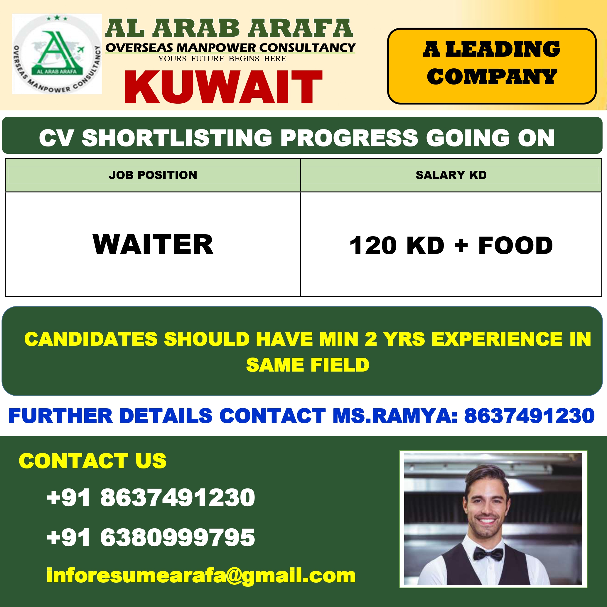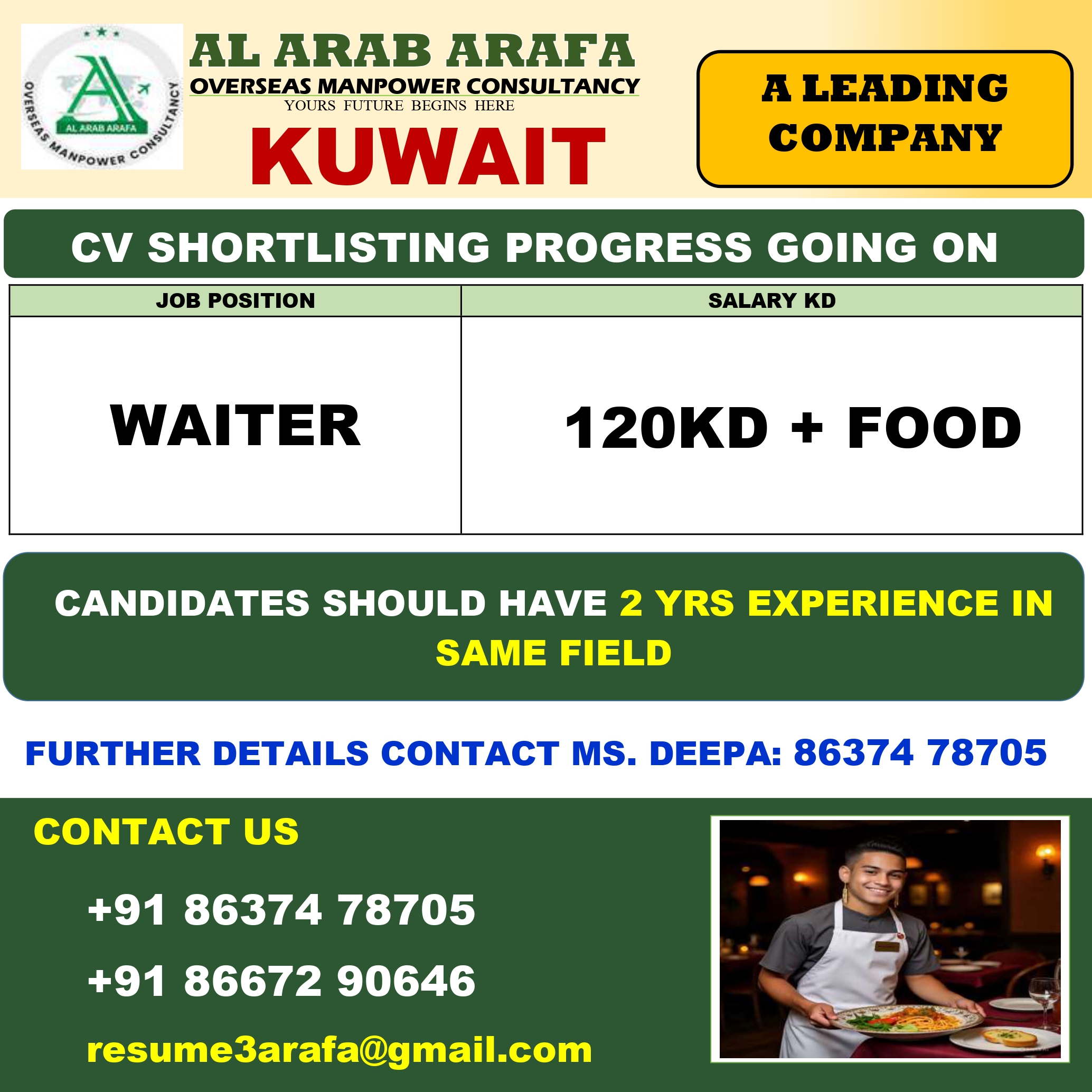 HIRING FOR KUWAITLAUNDRY COMPANY(1) CASHIERSalary: 160 KD(2) LAUNDRY MANSalary: USD 115 KDDuty: 12 Hours2 Days off in MonthNotes: Above Salary includes Food AllowanceCall/WhatsApp:9892097893 / 9892119313 / [email protected] CONSULTANCY SERVICESLIC NO:…