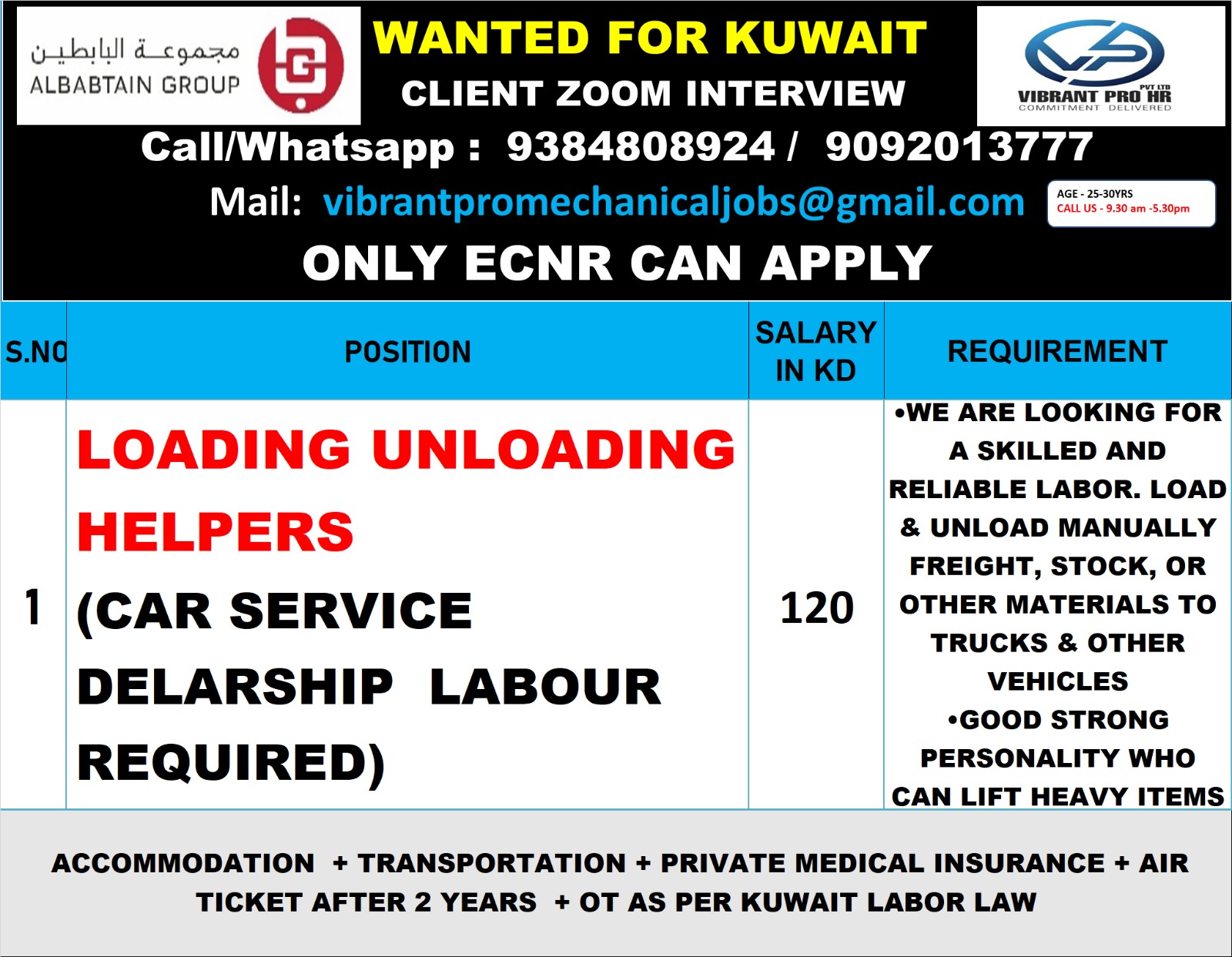 S.NO POSITION SALARY IN KD REQUIREMENT 1 LOADING UNLOADING HELPERS (CAR SERVICE DELARSHIP LABOUR REQUIRED) 120 •WE ARE LOOKING FOR A SKILLED AND RELIABLE LABOR. LOAD & UNLOAD MANUALLY FREIGHT,…