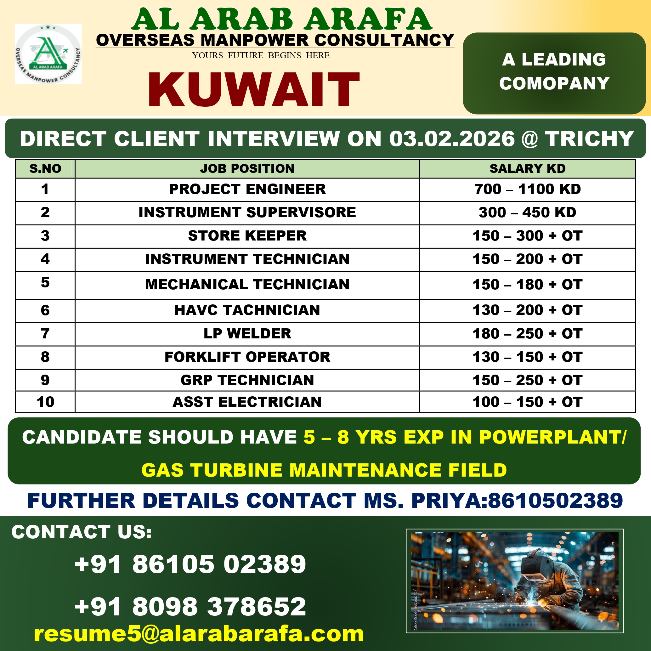 GREETINGS FROM RK GULF TRAVELS, BHILAI. HIRING FOR A LEADING & BIGGEST FACILITY MAINTENANCE COMPANY – KSA DIRECT CV SELECTION WITH ZOOM MEETING INTERVIEW ON 07TH/08TH/09TH JANUARY-2026. CANDIDATES SHOULD HAVE…
