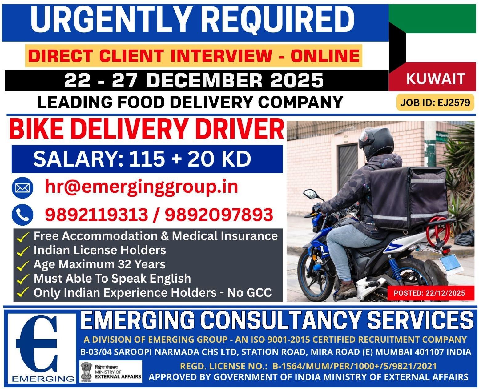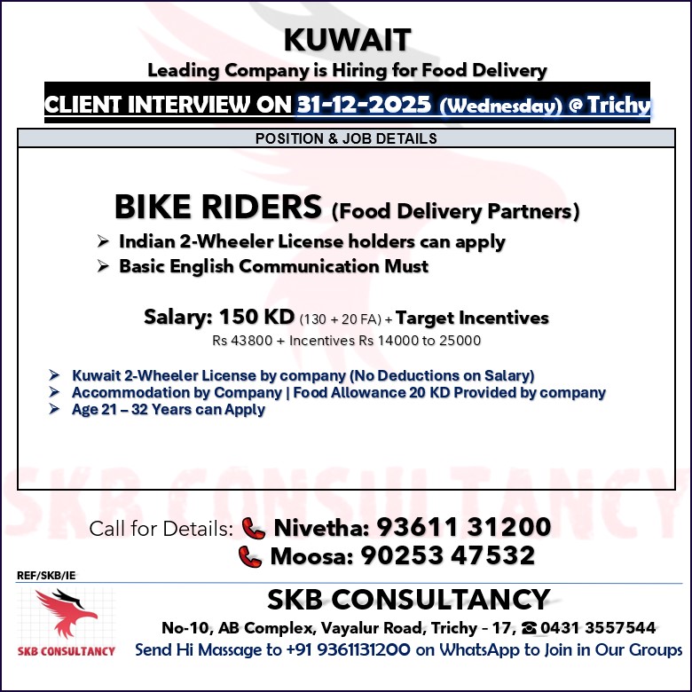 HIRING BIKE RIDERS FOR FOOD DELIVERY, CALIENT INTERIVIEW ON 31-12-2025 AT TRIHCY, CALL FOR MORE DETAILS: 9361131200, 9025347532. SKB CONSULTANCY, TRICHY – 17.