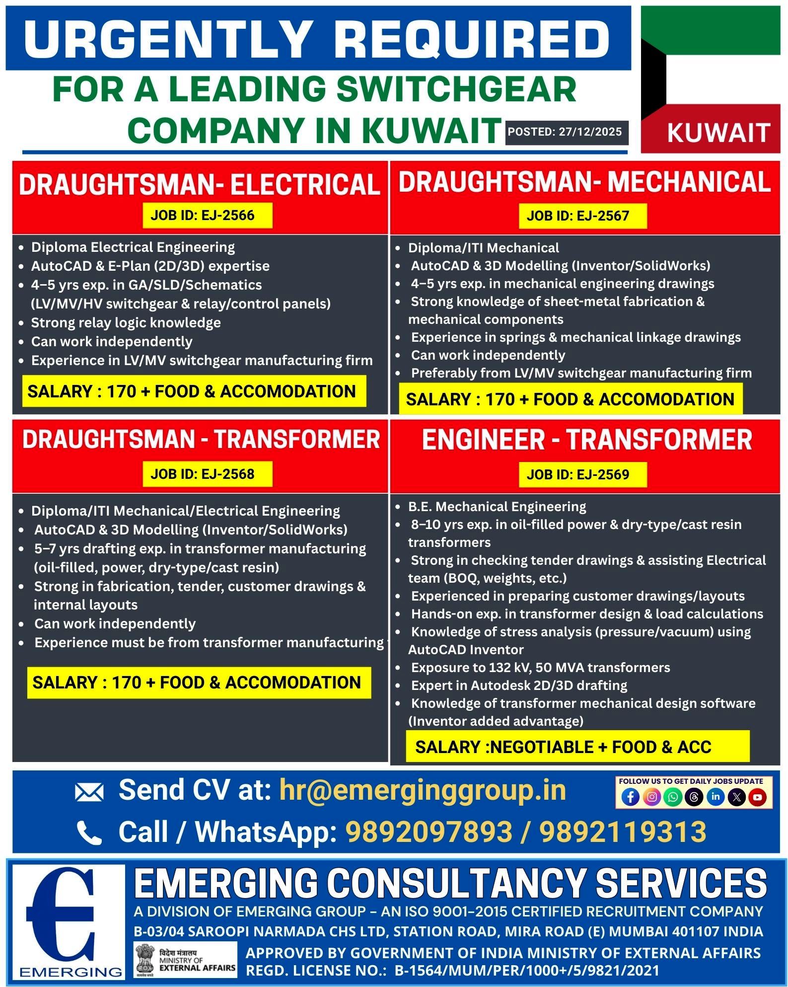 Required for Kuwait We are hiring qualified and experienced professionals for multiple technical positions. Candidates with strong experience in LV/MV/HV Switchgear or Transformer Manufacturing are preferred. AVAILABLE POSITIONS & JOB…