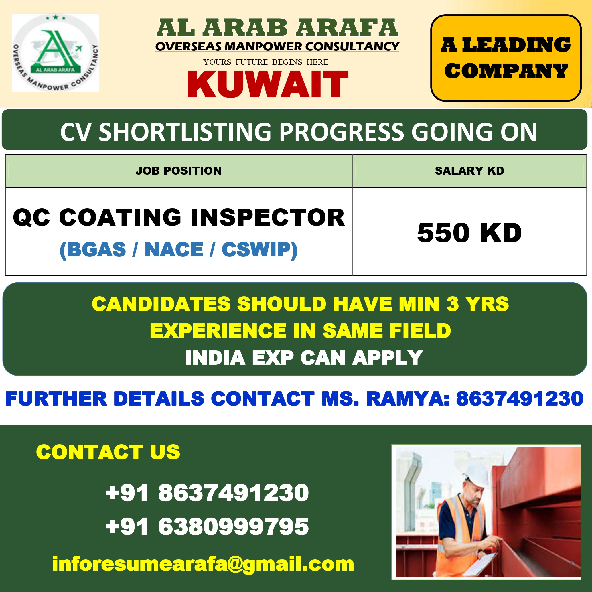 GREETINGS FROM RK GULF TRAVELS, BHILAI. HIRING FOR AL MABANI CONTRACTING COMPANY – SAUDI ARABIA DIRECT CV SELECTION WITH TRADE TEST CERTIFICATES REQUIRED. CANDIDATES SHOULD HAVE MINIMUM 5-6 YEARS EXPERIENCE…